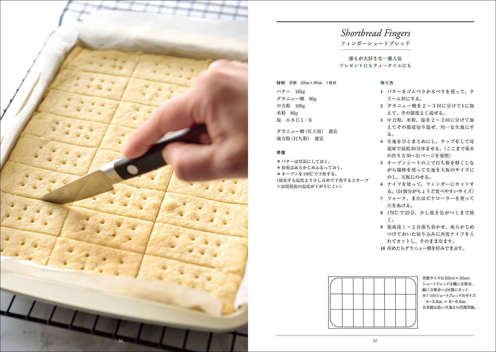 内容はまずは基本のショートブレッドの作り方を写真付きで解説している。ショートブレッドの材料は小麦粉、バター、砂糖に好みで塩少々というシンプルなもの。基本に米粉を混ぜた1番人気の「フィンガー・ショートブレッド」をはじめ、アーモンド、シナモンやアールグレイ、全粒粉やオートミールなどを加えた応用レシピも掲載している。