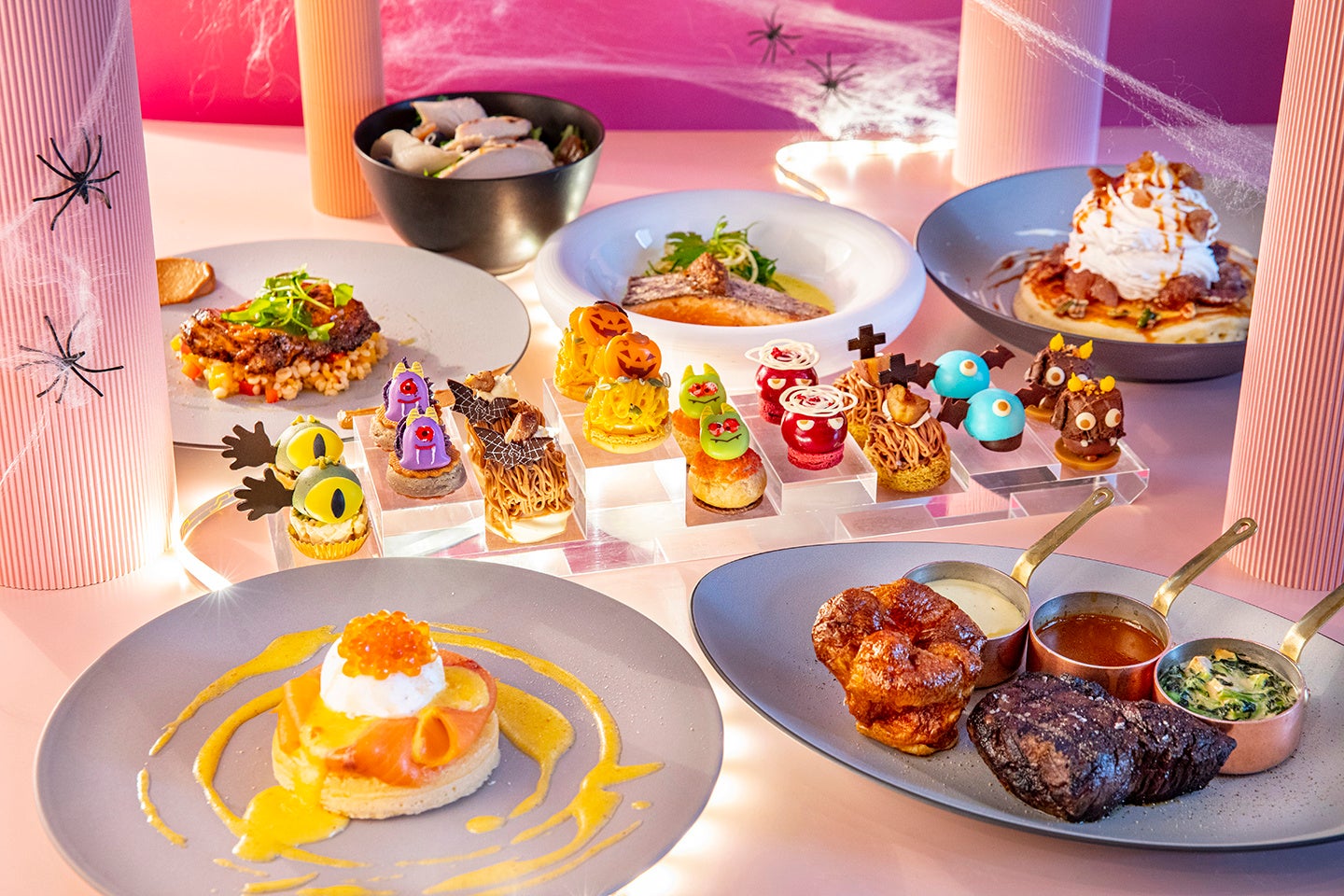 店内でも、ディストリクトの人気ブランチメニュー5 種から選べるメインと季節のサラダ、スイーツがセットになった「キンプトン ハロウィン“モンスブラン” アフタヌーンティー」、ディナーもアフタヌーンティーも両方食べたいというリクエストを叶える「オールフォーミー」も提供する。