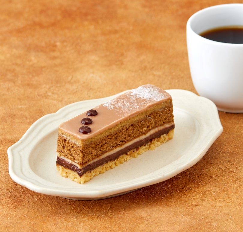 「黒糖ミルクティのオペラ」は、アールグレイを使用し紅茶の香りが際立つ黒糖ミルクティ味に仕上げた、上品でやさしい甘さが広がるオペラケーキ。アールグレイのスポンジとミルクティムースのほか黒糖ミルク味のムースやガナッシュなどを重ね、底面に食感のよいクランブルを敷き詰めた6層の美しい断面が特長だ。