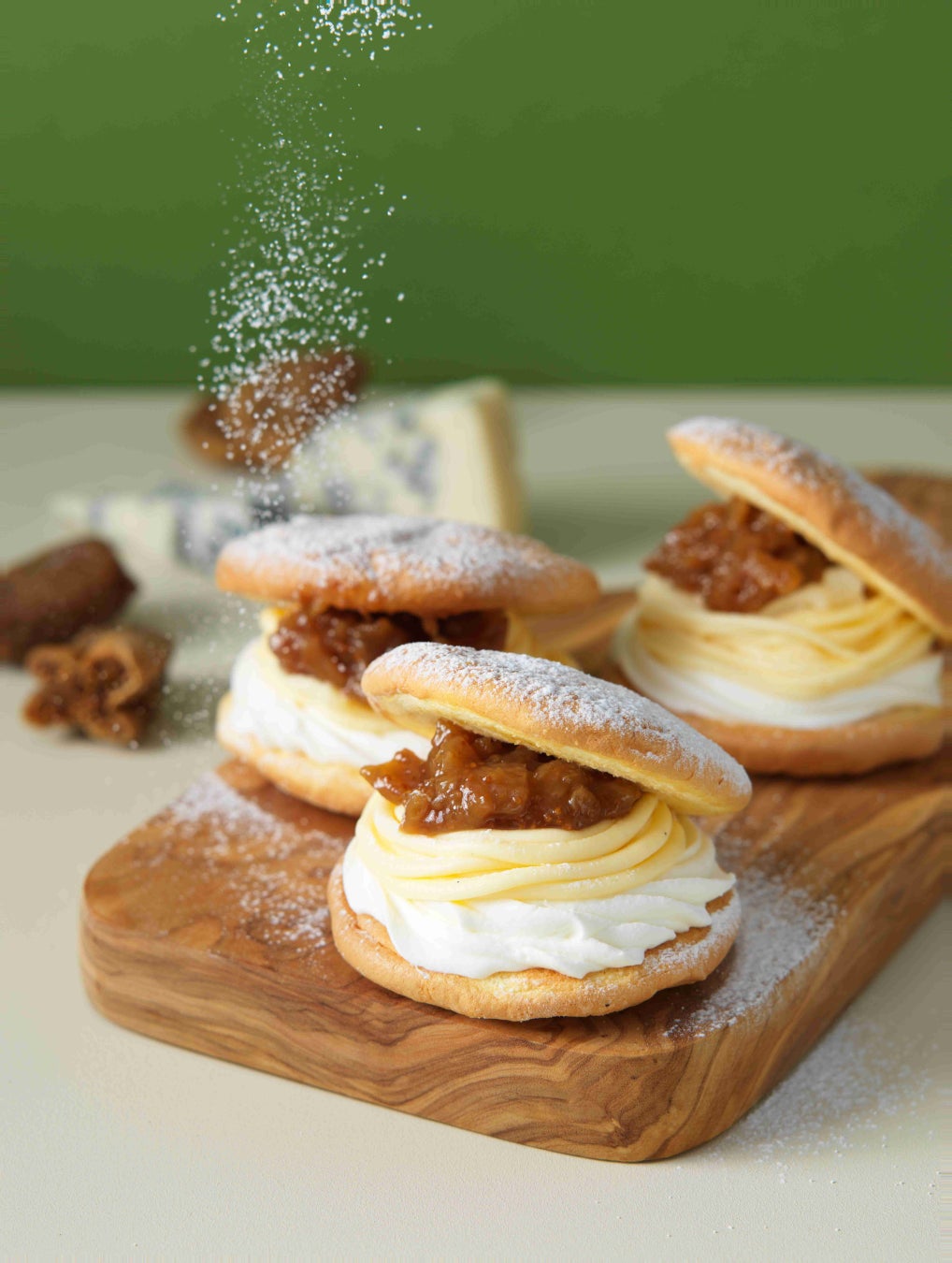 工房で出来立てのふんわりしっとりとした生ブッセ生地にブルーチーズ生クリームとカスタード、白いちじくのコンフィをトッピングし、濃い味わいに仕上げた。