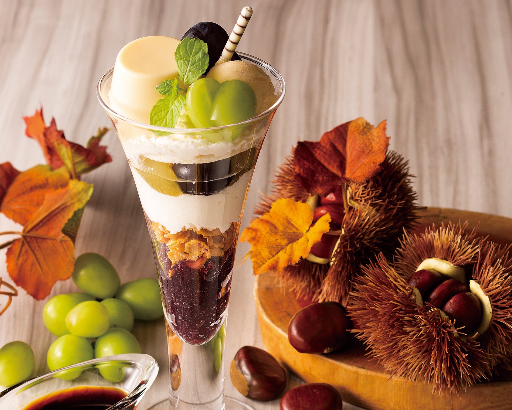 ぶどうのパフェは、みずみずしく甘いシャインマスカットを飾り、中の層には巨峰のコンポートを敷き詰め、2種のぶどうを味わえる。一番下のぶどうのジュレの部分には白ワインを加え、大人な味わいが余韻をもたらす。パフェの中には生クリームやフレークが食感のアクセントに。やさしい甘さのミルクプリンを添え、ほろ苦いカラメルソースをかけて味の変化も楽しめる。