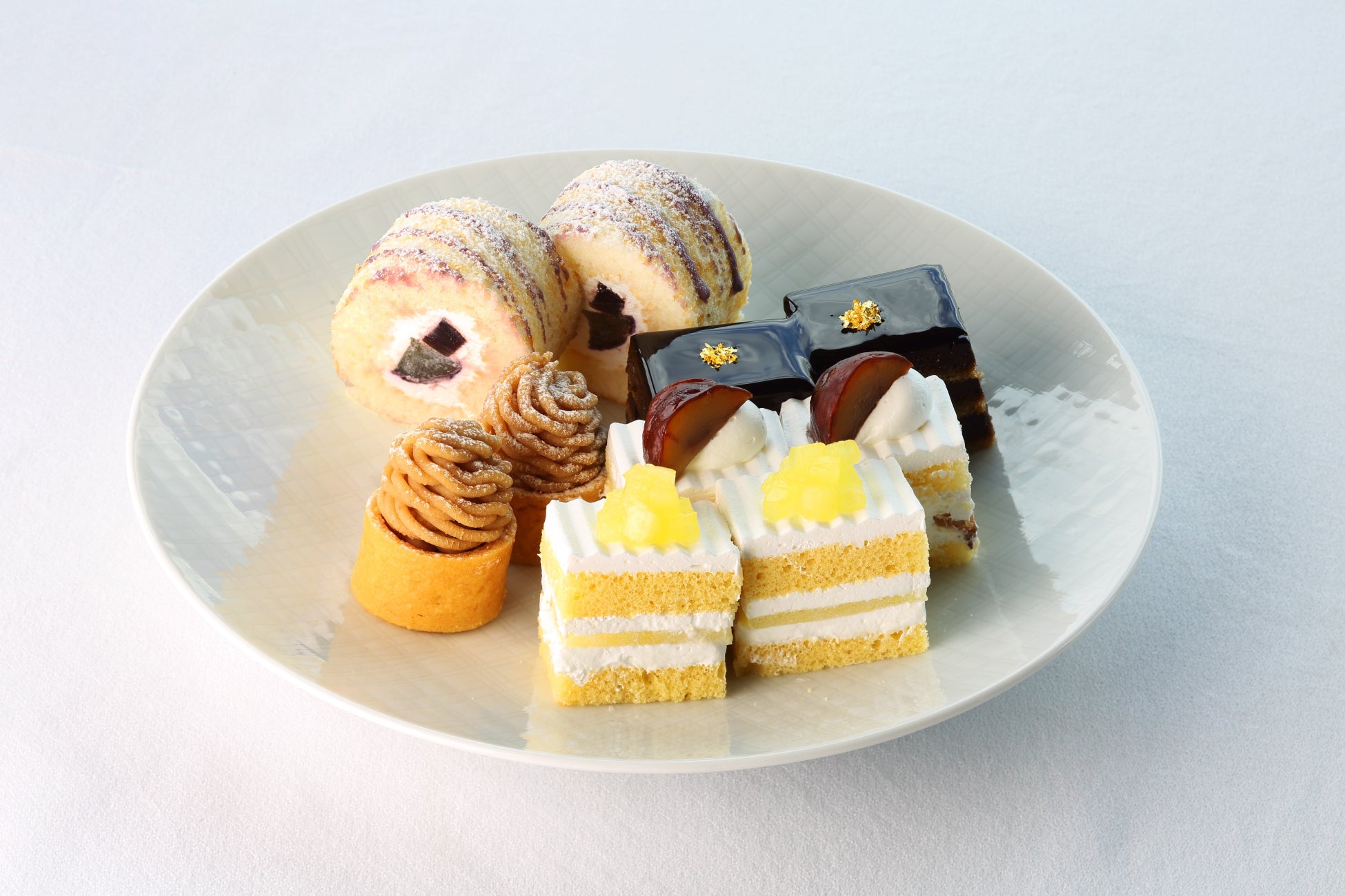 今回のアフタヌーンティーは栗とぶどうをテーマにした秋の訪れを感じさせる内容に。上段には栗をふんだんに使用した上品な甘みが特徴の「マロンショートケーキ」やぶどうをスポンジで包み込んだ「ぶどうロール」などニューオータニ自慢の秋のスイーツを用意。
