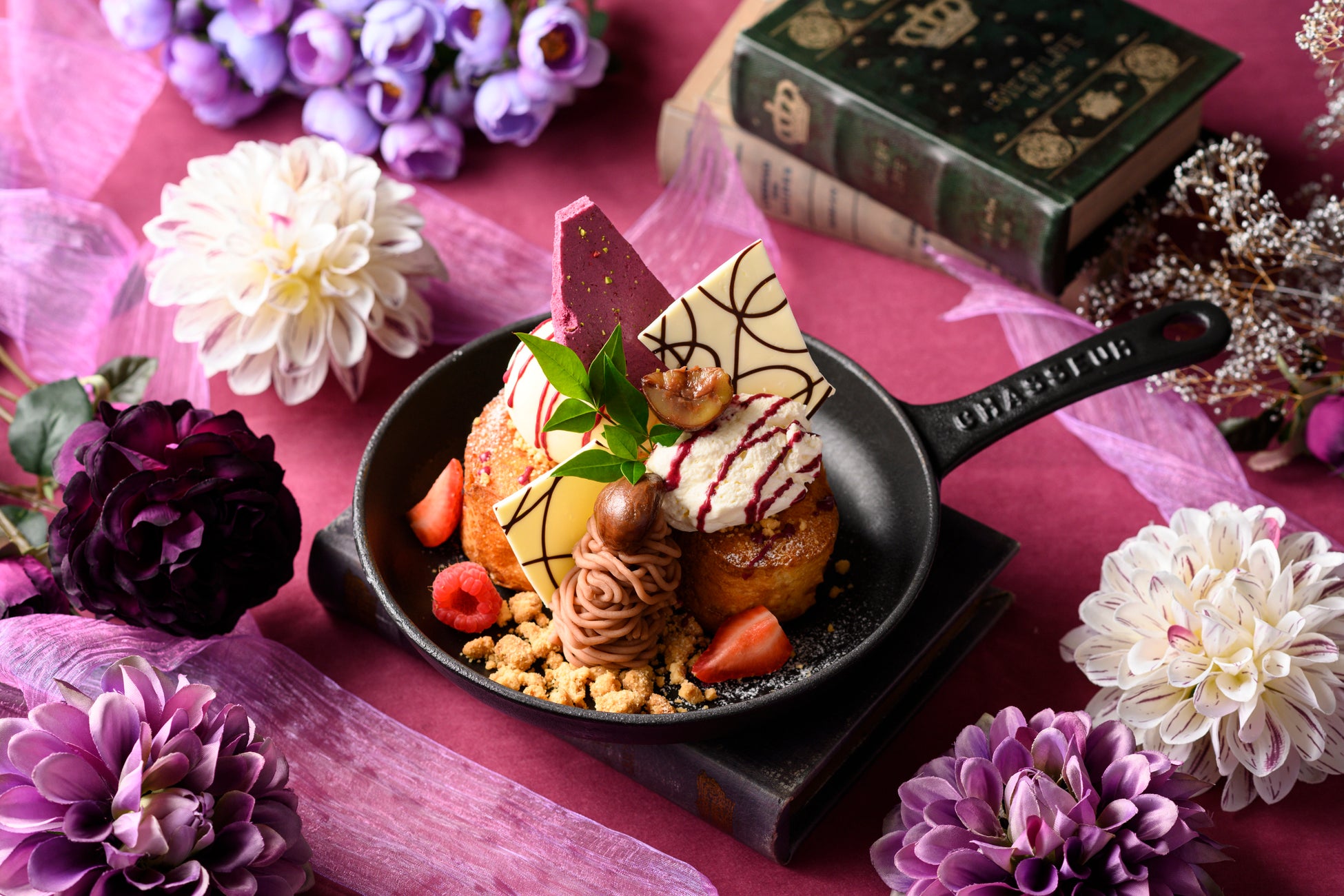 アニヴェルセルカフェの定番商品パンペルデュが秋仕様のバイオレットカラーをまとって新登場。秋の味覚であるマロンやメープル、カシスとあんずが香るクリームが相性抜群。自家製バニラアイスや熱々のパンペルデュと合わせて。