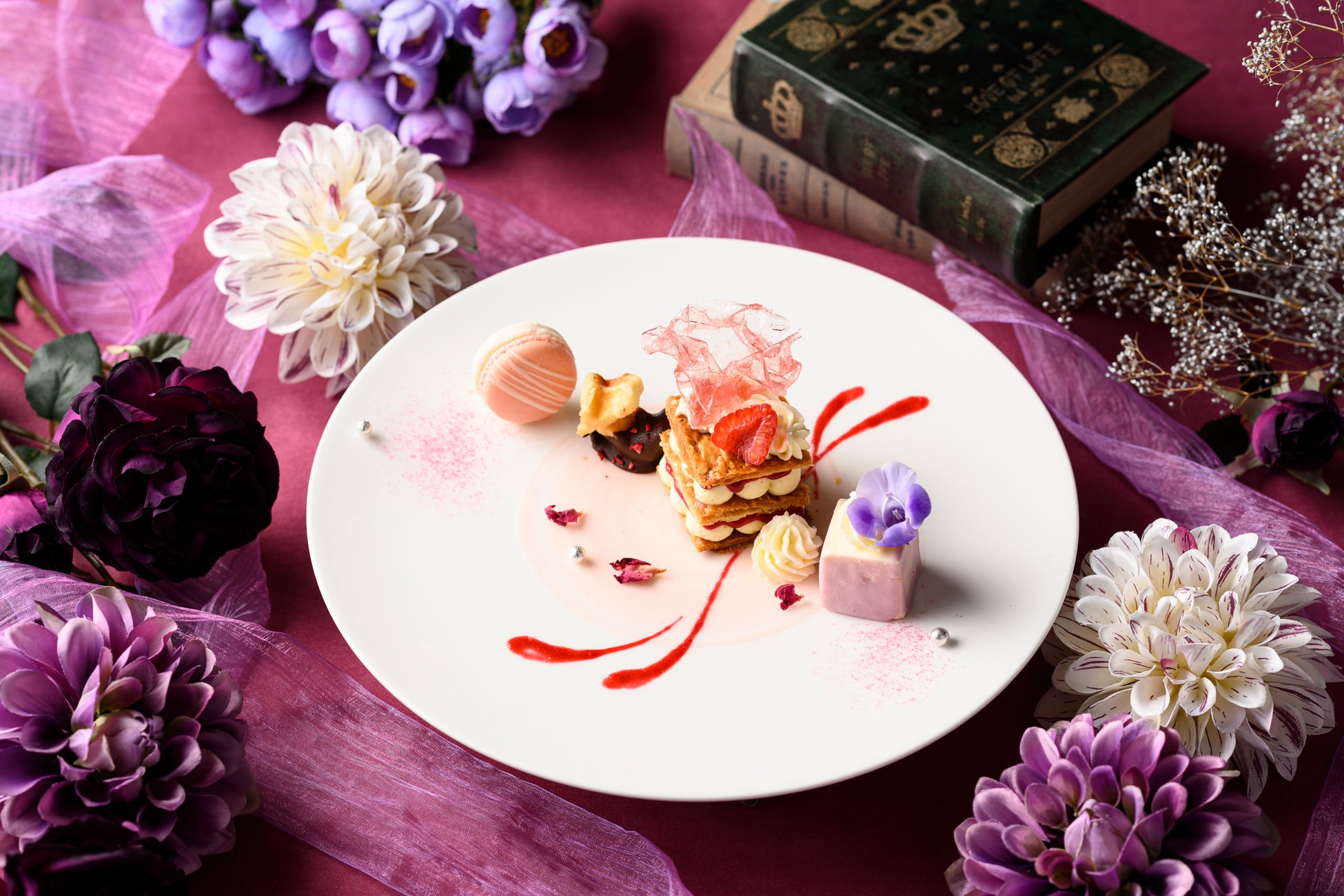 バイオレットを基調としたエレガントで華やかなスイーツプレート。「カシスマカロン」「チョコレートワッフル」「いちごのミルフィーユ」「ホワイトチョコレートムース ブルーベリーソース添え」といったパティシエ自慢のデザートに心が躍る。ミルフィーユはサクサクの生地とバニラを贅沢に使用したクリーム・苺のコンフィチュールをサンドして香り豊かに仕上げた。