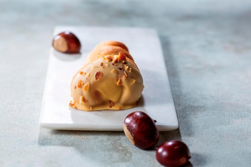 ゴディバのチョコを使用したガナッシュとマロンクリームを詰め込んだ秋限定の栗のコロネ。仕上げにキャラメル風味のチョコをコーティングし、香り豊かなローストアーモンドをトッピング(二子玉川店では取扱いなし)。