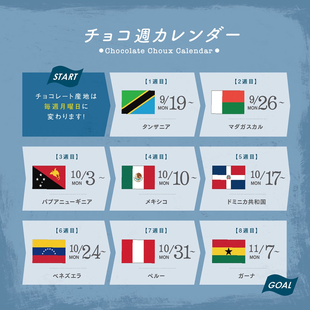 「タンザニア」がテーマである初回の9月19日から25日の期間は、洋ナシや柑橘類の果実味を感じさせ、酸味と苦みのバランスが絶妙なタンザニアのチョコレートをクリームに使用し、カスタードとラズベリーを合わせたリングシューを1個500円で販売する。