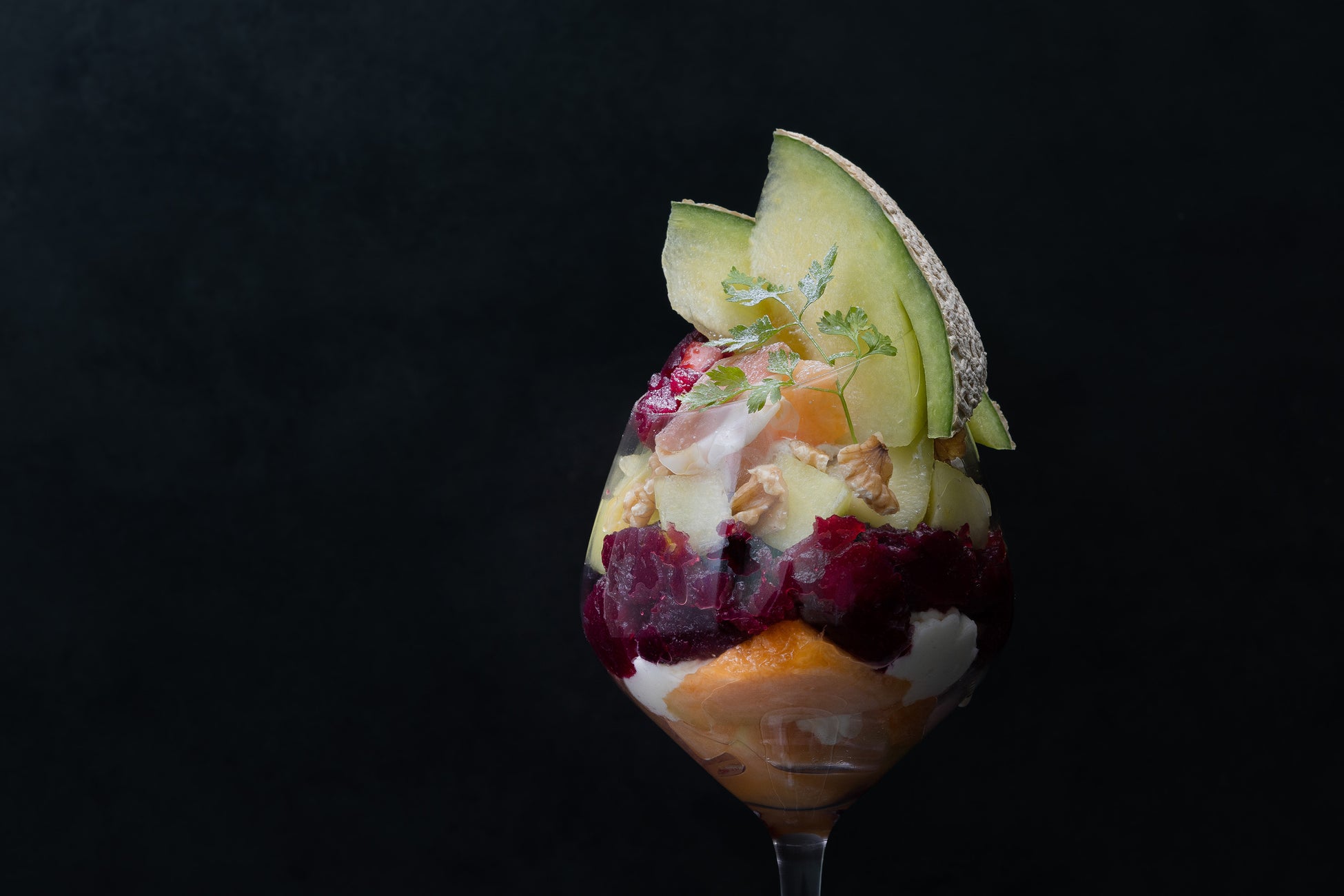 メインは生ハムをまとった秋のメロン。そこに、フランボワーズ、ブルーベリー、りんご、オレンジをスパイシーなシナモンと赤ワインに漬け込んだサングリアのジュレと、和栗のモンブランをあわせた。