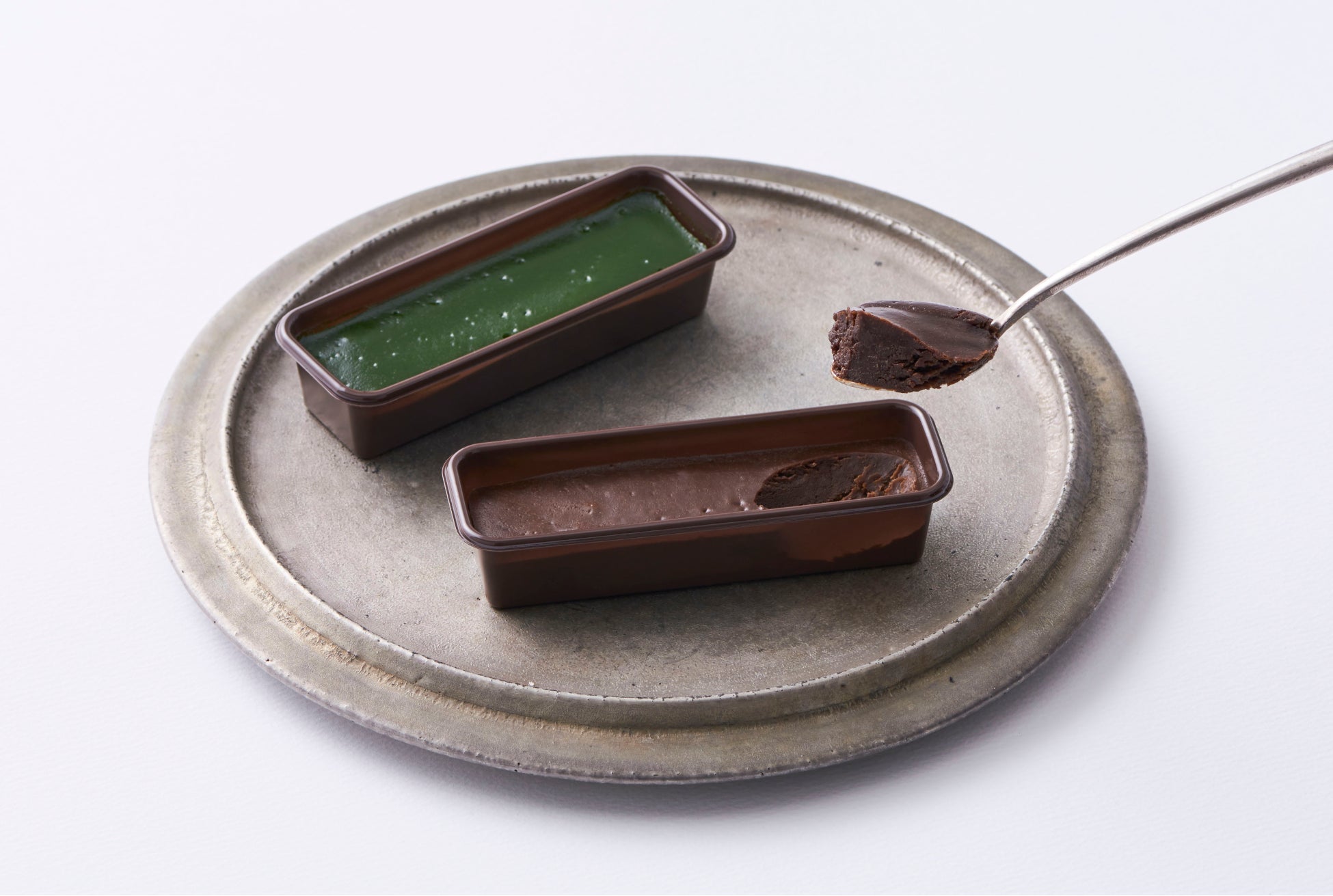 パッケージデザインも一新し、マットなチョコレート・抹茶色に。なめらかなガトーショコラの質感を表現した手書きの英字は、金箔をあしらい高級感を演出している。