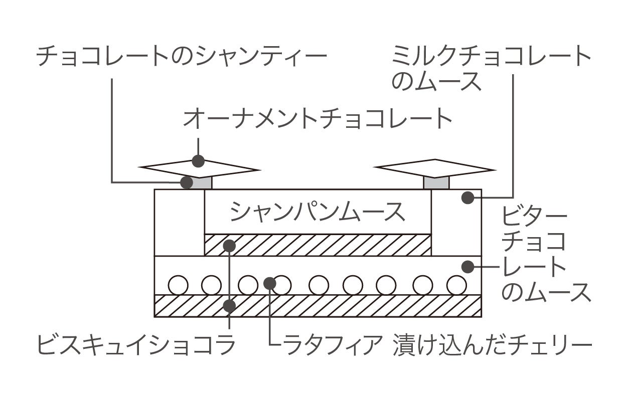 主役となる、レモンがさわやかに香るシャンパンのムースを中心に、それを囲むチョコレートムースには、合わせるチェリーやベリー系の甘酸っぱい果実と相性のよいミルクとビターの2種類のチョコレートを選び、ムースの層によって2種類の配合率を変えて、シャンパンのムースに合わせたほどよい甘味と苦味を表現。