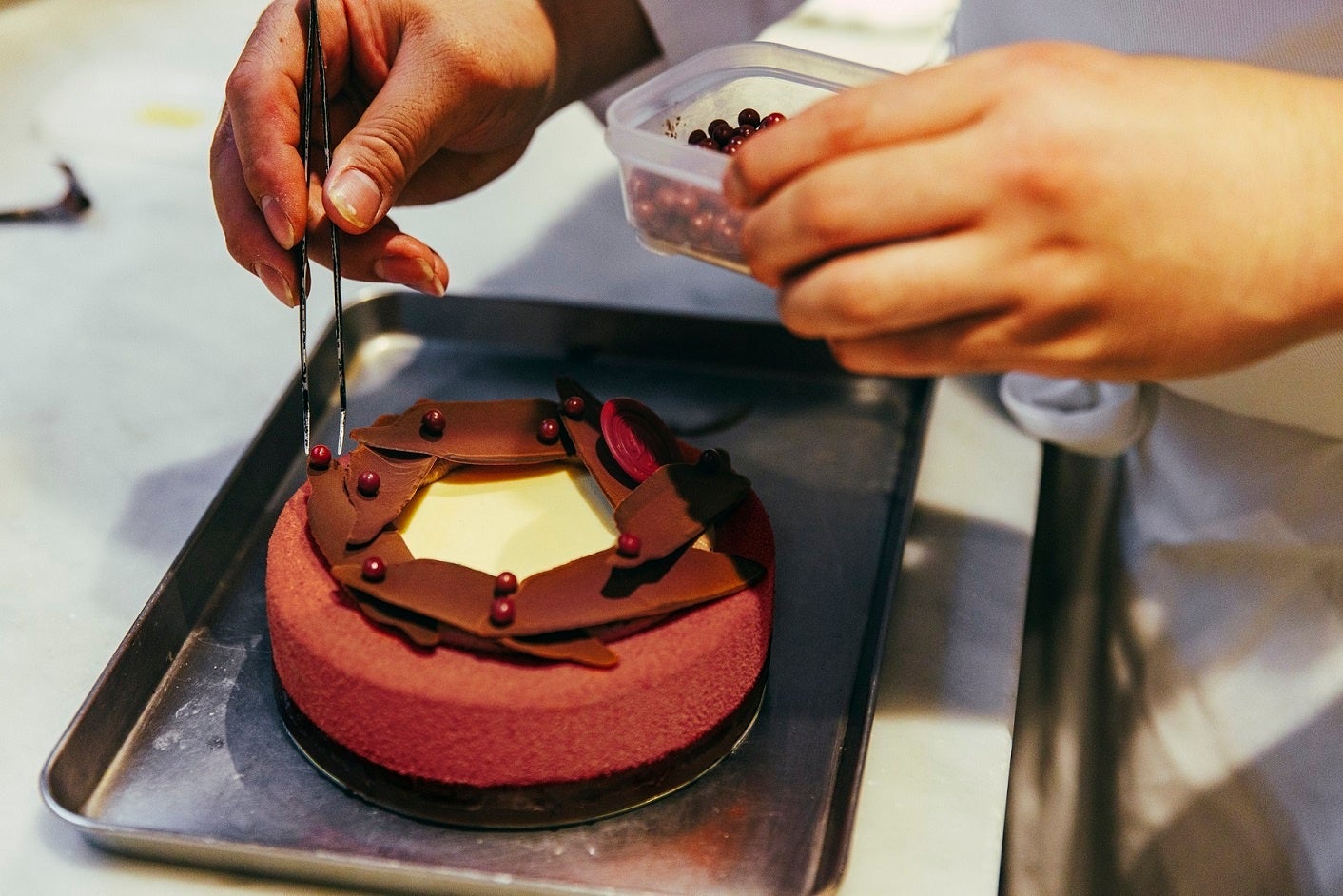 今回、吉田さんが今年のクリスマスのために考案したのは、チョコレートとチェリー、洋酒のキルシュを使った伝統菓子「フォレ・ノワール」をベースに、シャンパンとラタフィア・ド・シャンパーニュ(VDL 酒精強化ワインの一つ)を贅沢に使用した、大人のパーティーシーンにぴったりなクリスマスケーキ「フォレ=ノワール シャンパーニュ」。