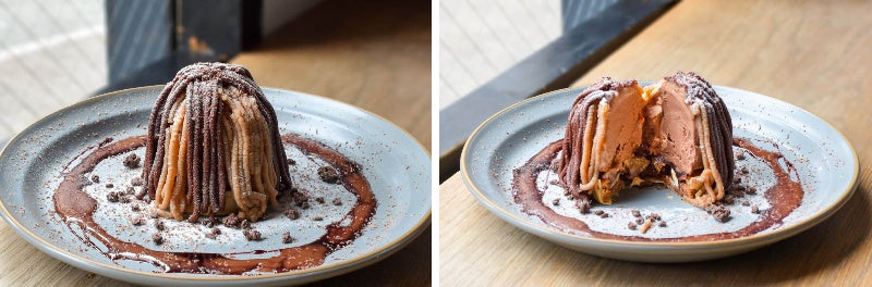 チョコレートに白あんを合わせた上品な甘味のチョコレートペーストと、栗ペーストの2種のペーストの下には、角切りでゴロッとした栗を混ぜたチョコレートアイスクリームが隠れている。デーツの赤ワイン煮も使うことで酸味と甘味のアクセントをプラス。土台のタルトは栗をのせて焼き上げている。