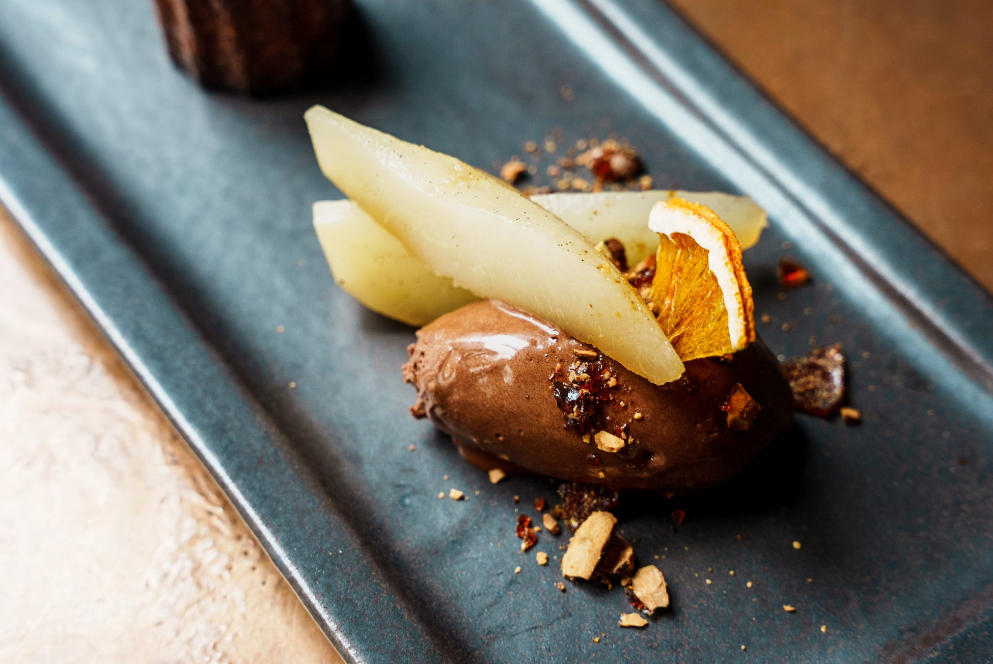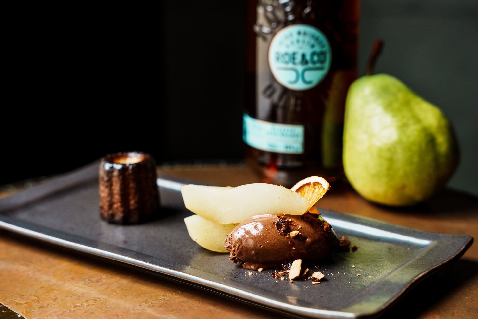 ウイスキーカヌレにペアリングしたのは、洋梨のコンポートとオレンジ風味のショコラムース。洋梨はウィスキーのボトルの底にデザインもされているアイルランドの象徴だ。ウイスキーカヌレと一緒に口にすることで、甘みや奥深さに加えてカカオやナッツの風味、そして余韻にほのかに感じるオレンジやライムなどの香りを楽しめる。