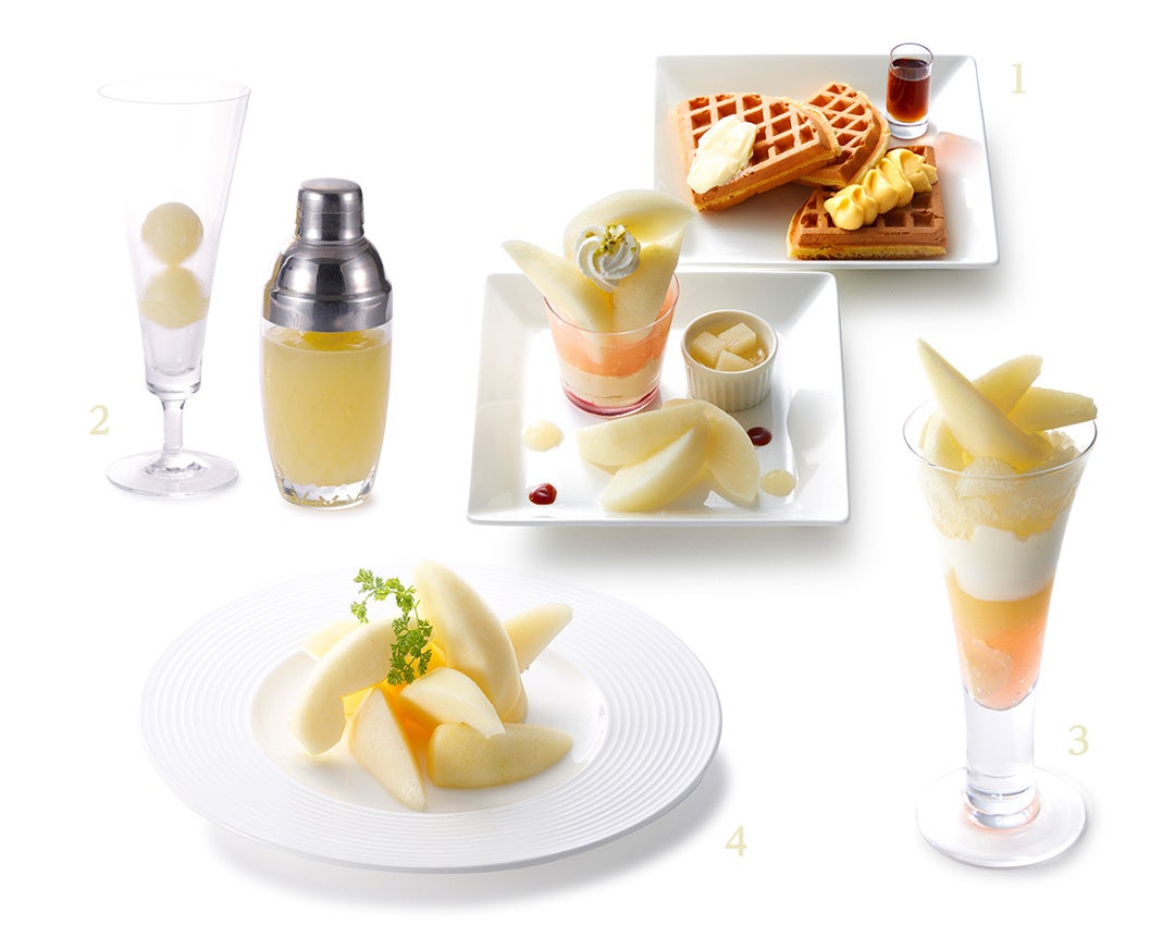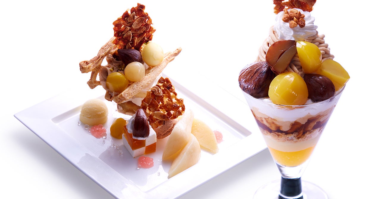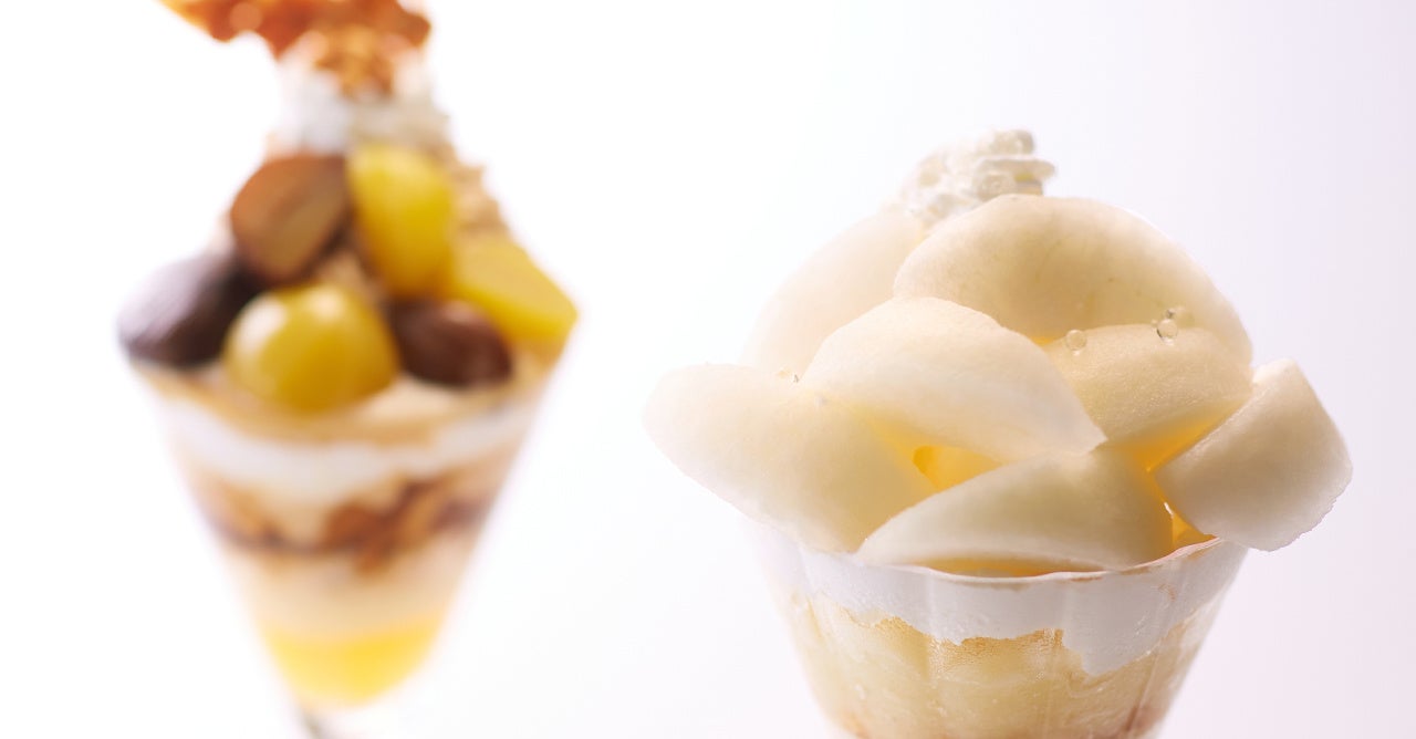 クリーム色のきめ細かい果肉で、なめらかな舌触りの洋梨。香り高く上品な甘みがある。ほんのり甘く、ほくほくとした食感をもつ栗は、まさに秋の味覚の代表。支店5店舗では栗と洋梨をテーマに「パフェ」2種「プレートデザート」「シーズナルトライフル」「ワッフル」「ジュース」を提供する。