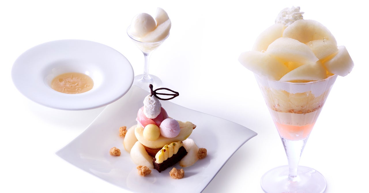 「洋梨のアソートデセール」は、洋梨をさまざまな仕立てて楽しめるアソートタイプの一品。洋梨のスープ、シャーベット、プレートには紅茶ブリュレをつめこんだ洋梨の果肉を。ダマンドやブラウニーとともにケーキ感覚で食べられる。税込み2,640円。