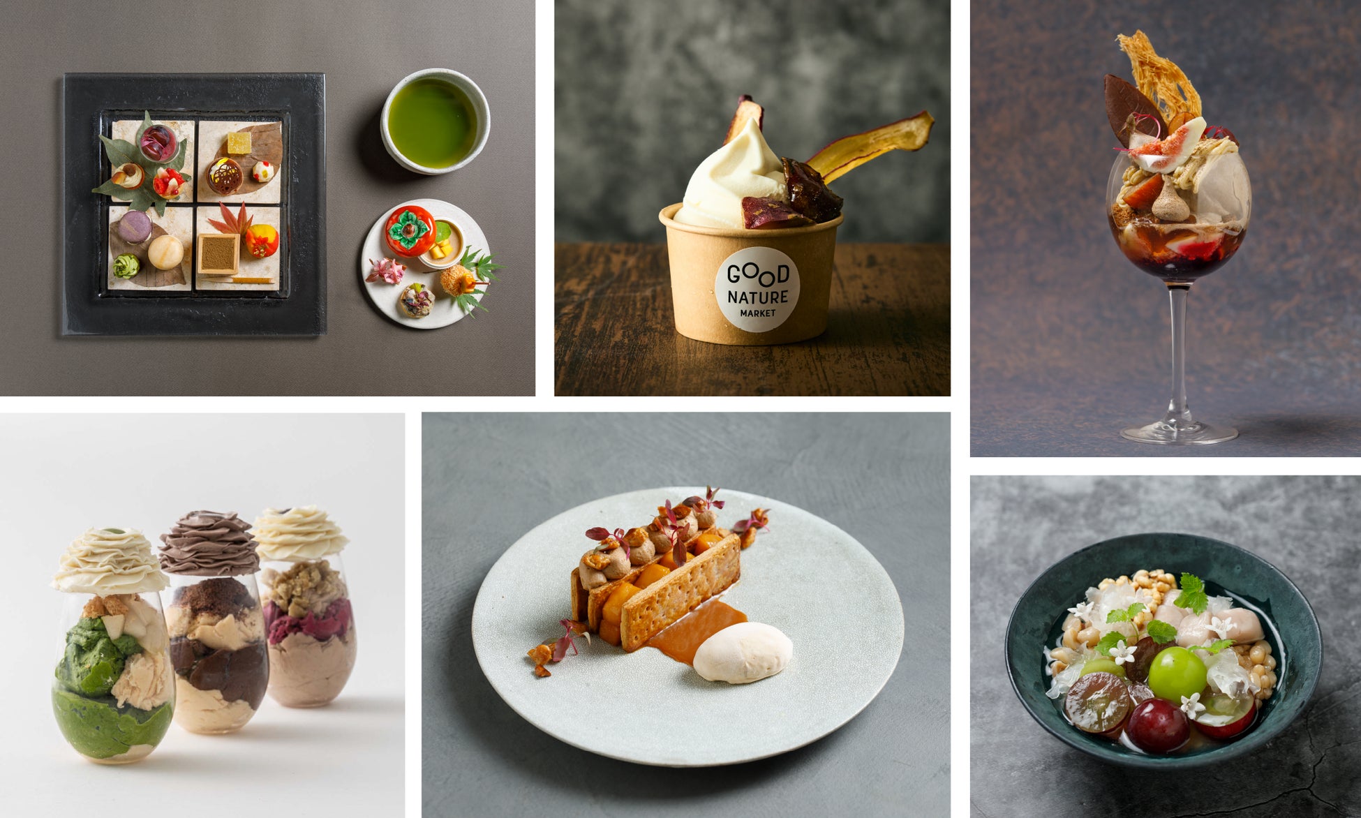 芋・栗・カボチャのほか、ブドウやリンゴなど旬の食材を使用したスイーツや、見た目も食感も楽しめるグラスデセールなど、ここでしか食べることのできない秋限定のスイーツを販売する。