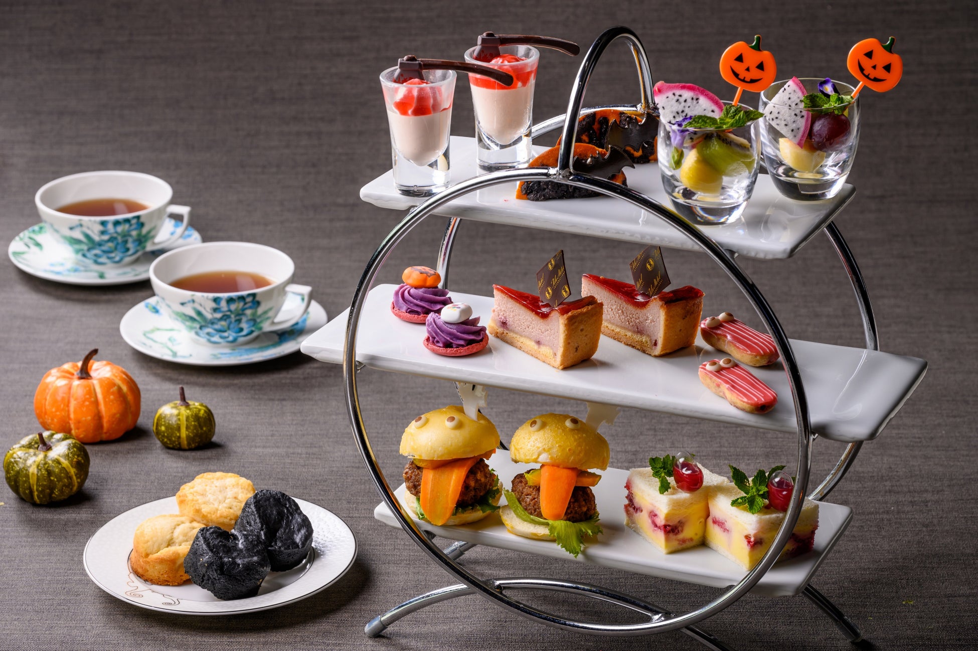 スタンドで提供するアフタヌーンティーは、コウモリをあしらったかぼちゃのパウンドケーキや、かぼちゃのピックをさしたフルーツをはじめ、中段には、お化けを模った砂糖菓子を添えた紫芋のオープンマカロンや、定番のチーズケーキなどのスイーツを用意。