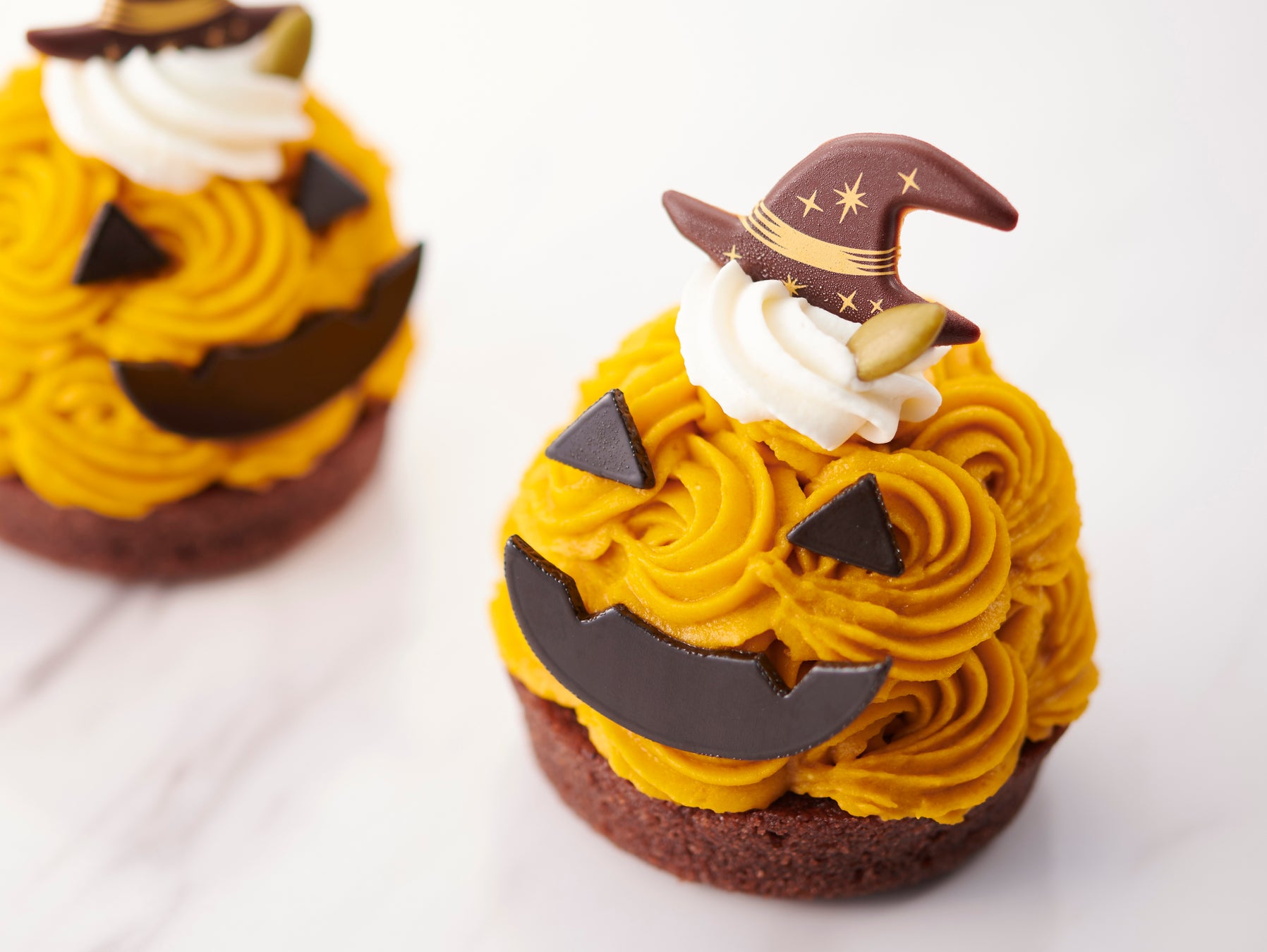 コクのある北海道産えびすかぼちゃを使用したなめらかなパンプキンクリームに、ほろ苦いキャラメル風味のクリームブリュレをとじこめ、ジャック・オ・ランタンをイメージして顔や帽子を飾った。