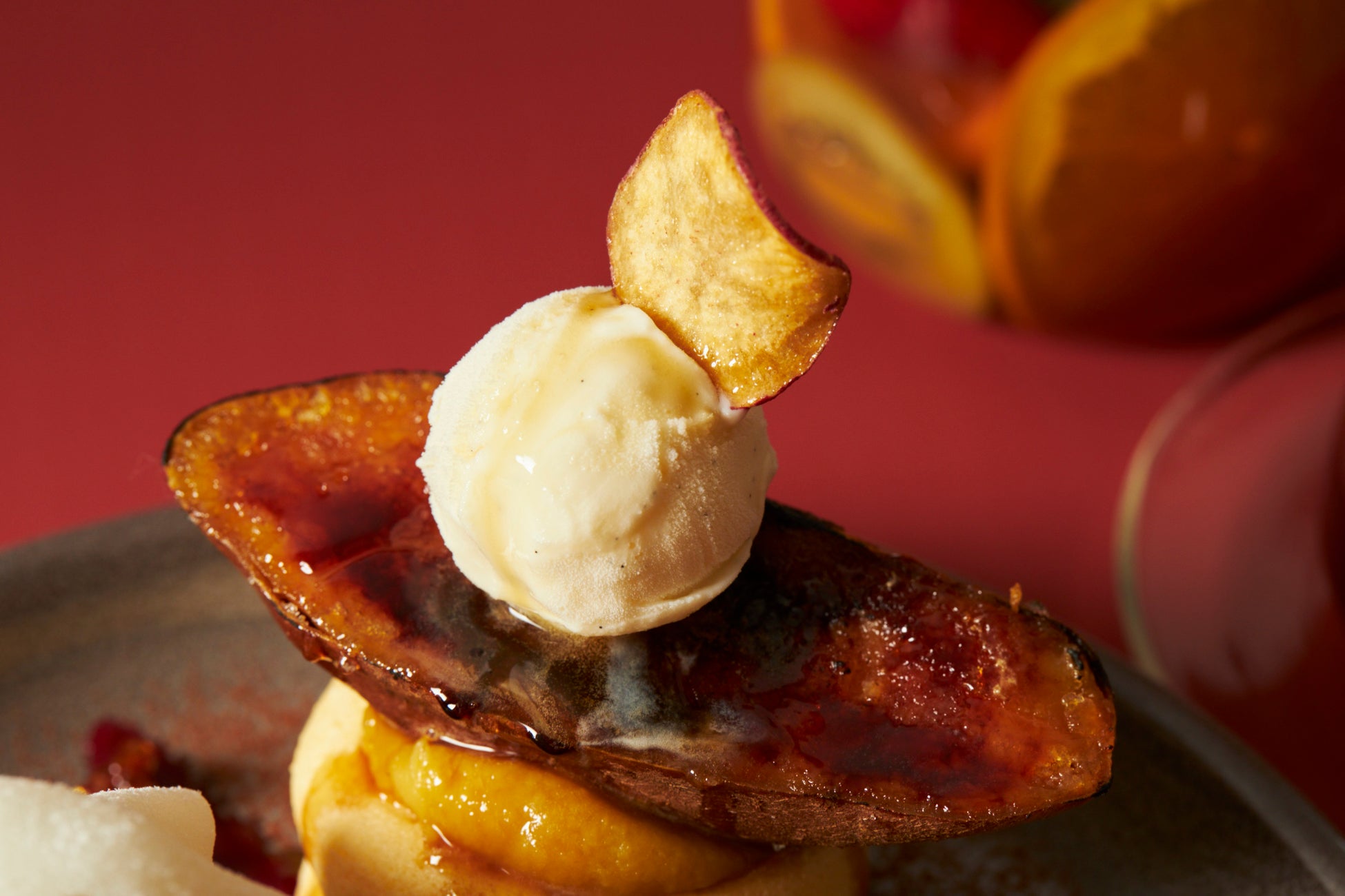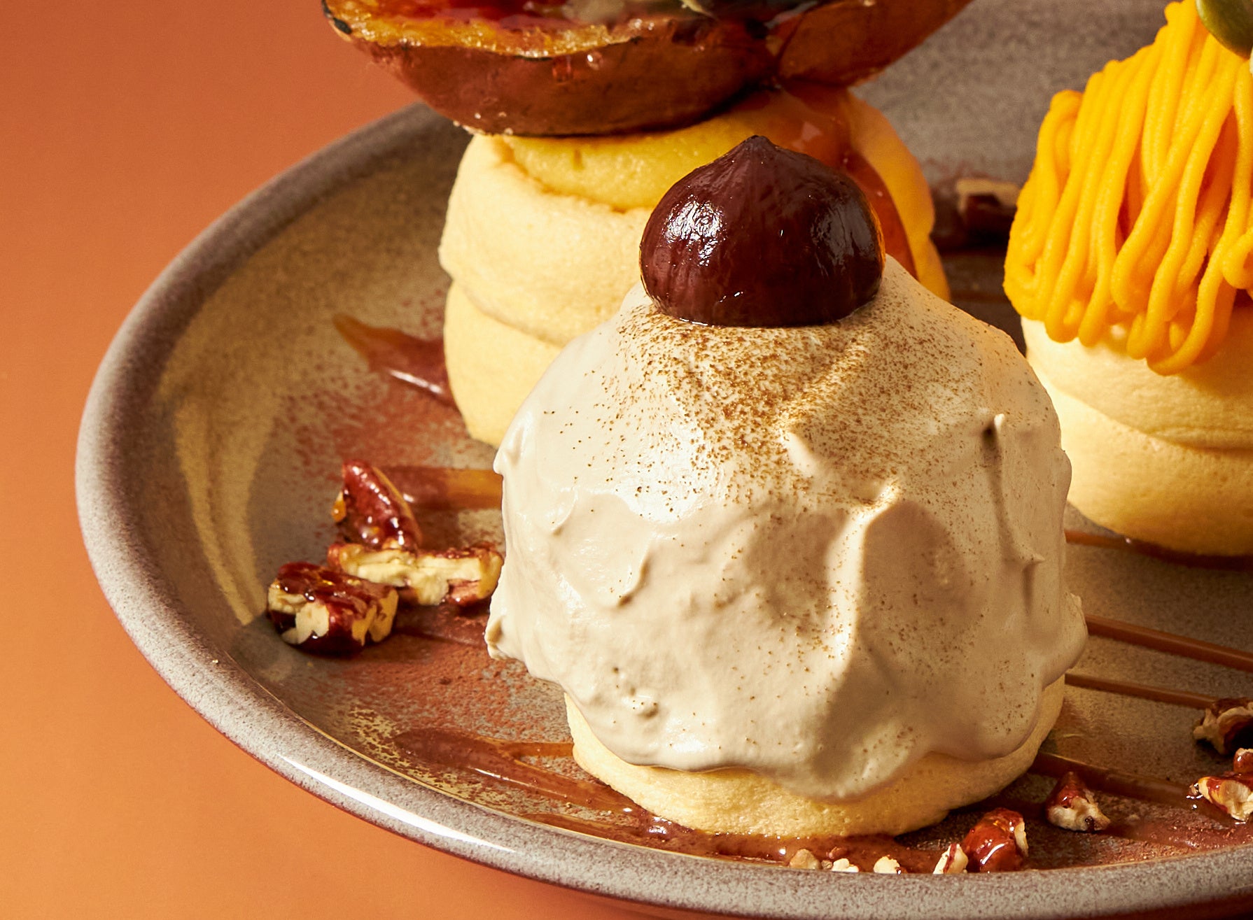鹿児島県産の冷やし安納芋のブリュレパンケーキは、甘くてしっとりした食感の冷やし安納芋とブリュレした香ばしさはバニラアイスと間違いない組み合わせ。安納芋クリームの追い芋で、さらに濃厚な味わいを楽しんで。
