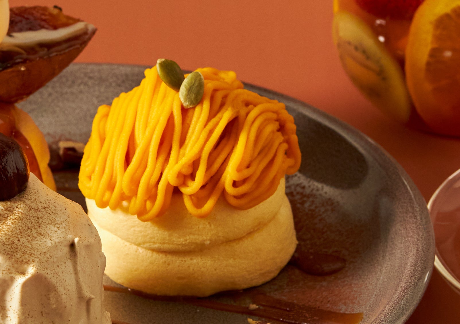 北海道産くりりんかぼちゃとホワイトチョコのモンブランは、北海道産のくりりんかぼちゃを使用したペーストにホワイトチョコレートを練り混み奥深いクリームで仕上げた。中にはキャラメルりんごの酸味とあっさりとした甘さのミルクアイスを忍ばせている。
