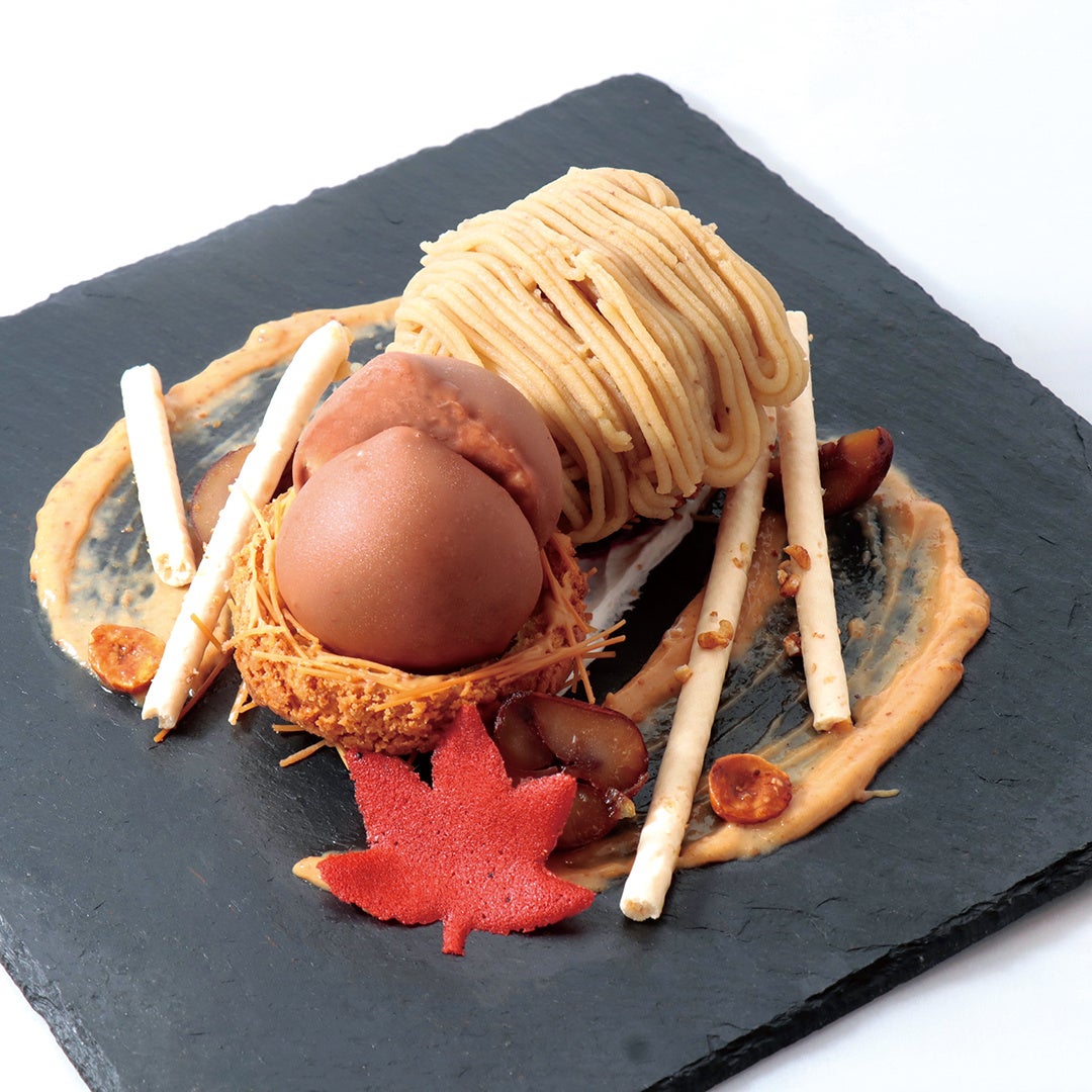 「モン・マロン ~秋の栗拾い~」は、“いが”に見立てた二つのシュー生地の一方に生クリームとモンブランクリームを、もう一方にひんやりと冷たいマロンムースをあしらった。同じ栗だが、クリームとムースでまったく異なる食感、味わいでつくっており、2種のシューを食べ比べできる。