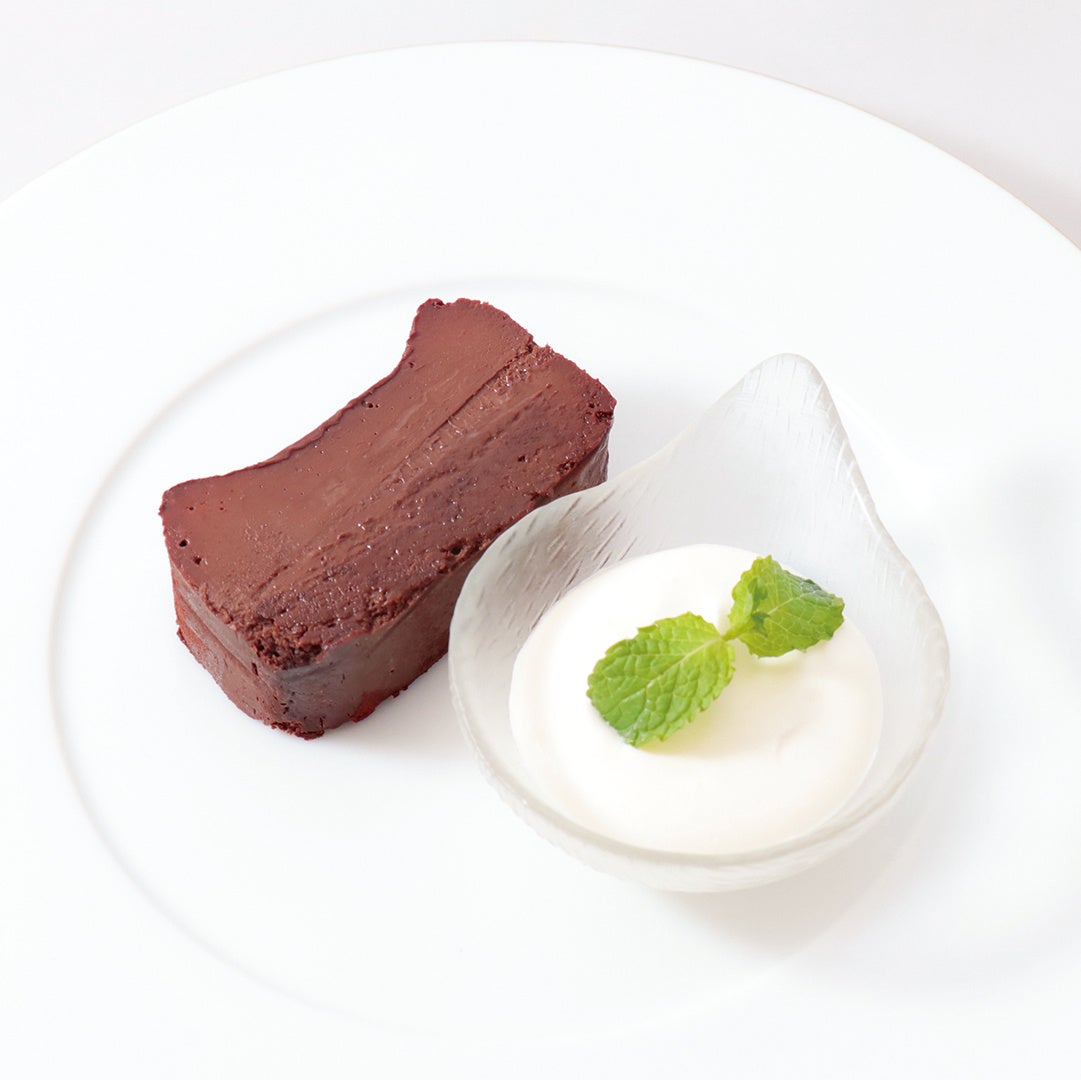 「テリーヌショコラ」は、マダガスカル産カカオを使用したヴァローナ社“マンジャリ”で作った。ほのかな甘みと酸味のバランスが心地よく、添えられた北海道産生クリームと一緒に召し上がっていただくと相性抜群。