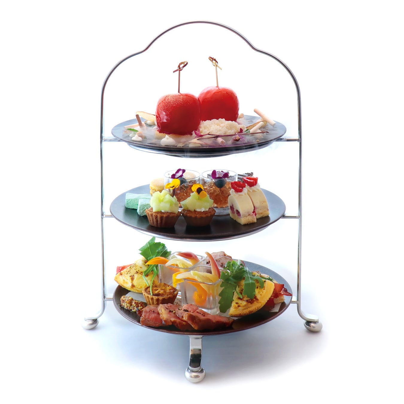 「PREMIUMアフタヌーンティーセット」は、上段にセバスチャン・ブイエスペシャルをのせた、ワンランク上のアフタヌーンティーセット。中段には、マカロンや焼菓子などのプティフール、下段にはサンドウィッチや鴨肉のスライスなど前菜からデザートまで楽しめるようなコース仕立ての内容だ。コーヒーや紅茶、ジュース類はフリーで楽しめる。なお同アフタヌーンティーセットは、WEB予約も承っている。