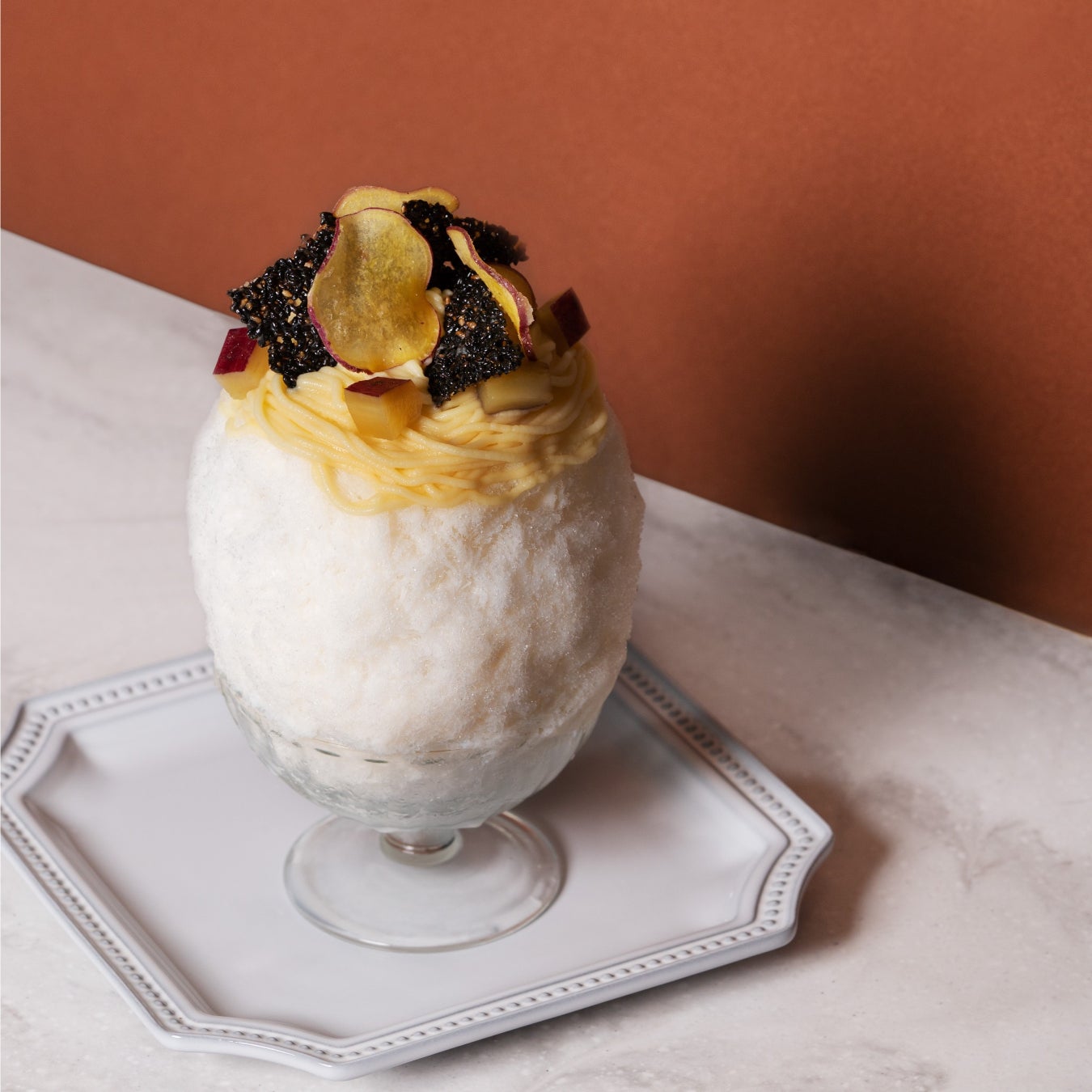 旬の食材をこよなく愛するパティシエならではの発想を生かした新感覚の「かき氷」。秋の主役は、なめらかな舌触りとやさしい甘さが魅力の「さつまいも」。素材本来のおいしさを堪能できるよう、モンブラン仕立てのさつまいもペーストを、帽子のようにたっぷりと乗せた。