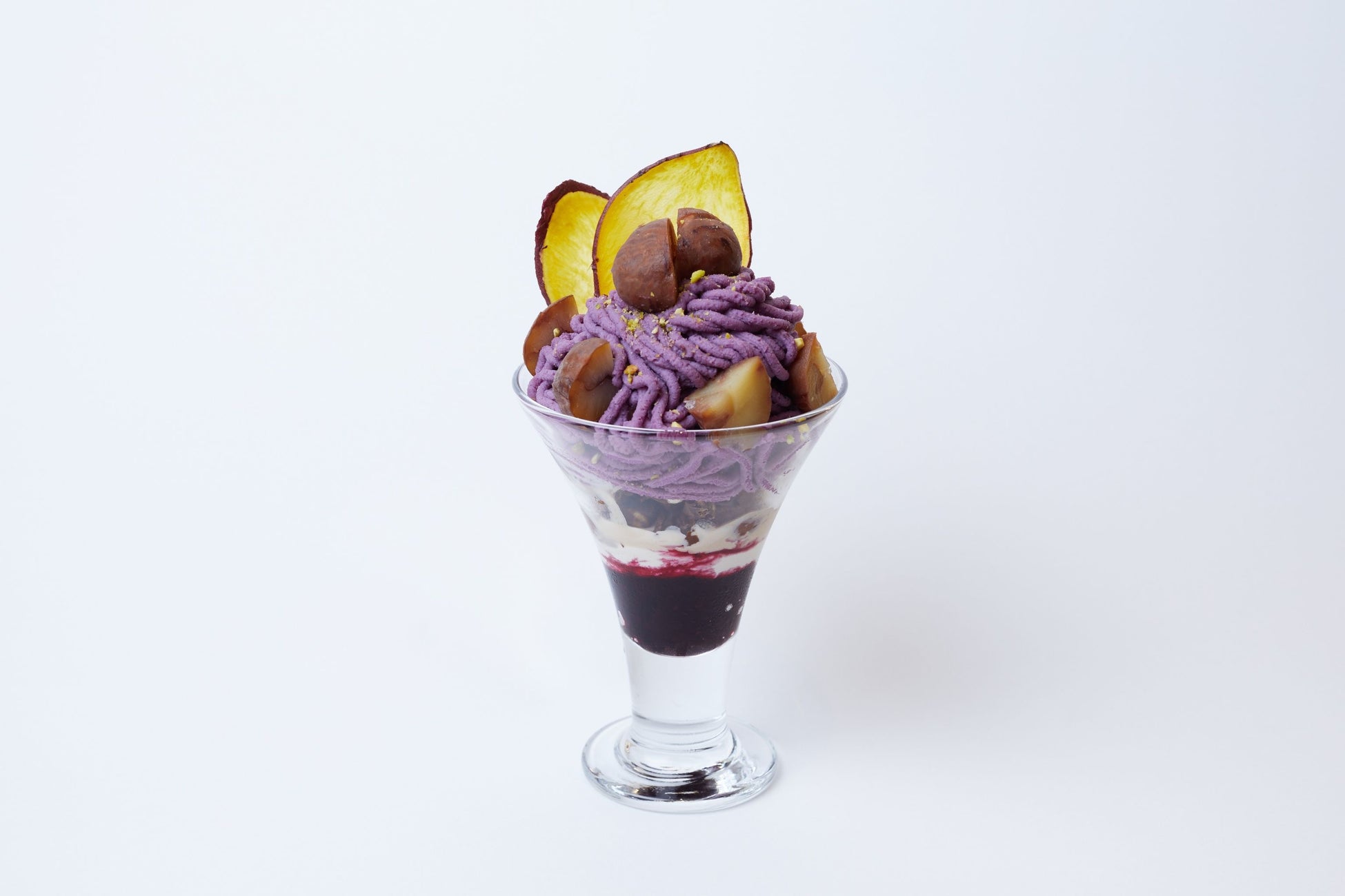 「栗とさつまいものモンブランパフェ」は、栗と相性の良いカシスソース、キャラメルアイス、渋皮の栗とムラサキ芋を練りこんだクリームでモンブラン仕立てにした。