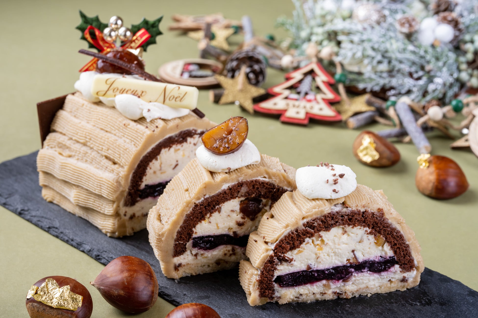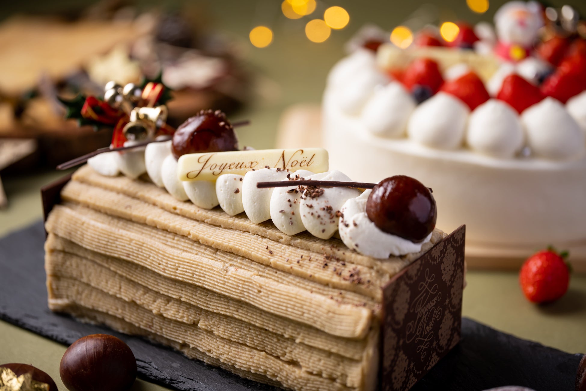 地元松川村のいちごを使用したホールケーキ「サンタのホワイトクリスマス」。なめらかな和栗のマロンクリームで仕上げた「森のごちそう マロンのブッシュドノエル」。さらにイートイン専用のクリスマスにぴったりガトーショコラを「EDEN カフェ&バー」にて用意した。