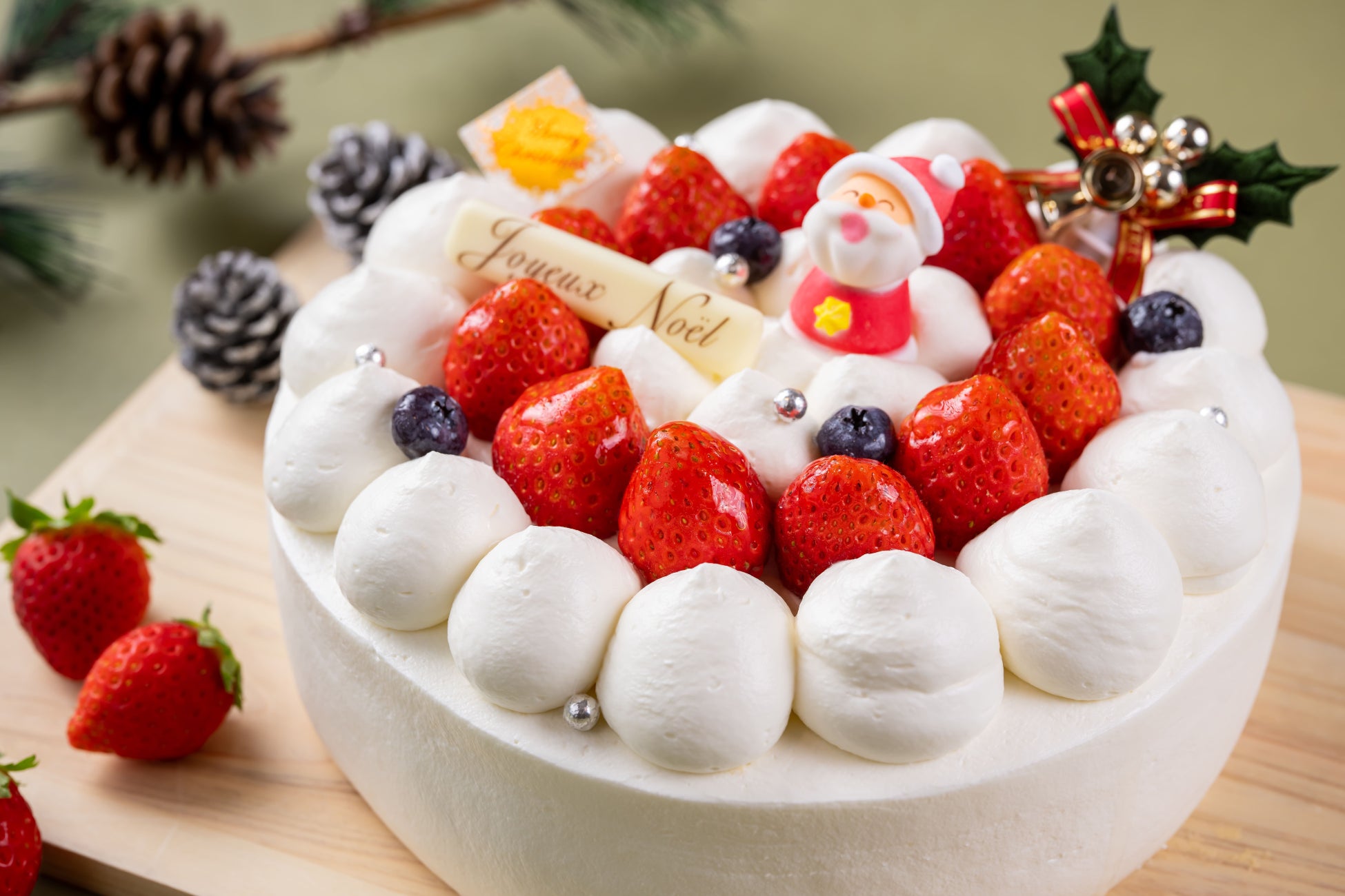 「サンタのホワイトクリスマス」は雪がたくさん降った信濃大町の夜をイメージ。北アルプスの麓で育った松川村産のいちごと大町産のブルーベリーがアクセントのトラディショナルなクリスマスケーキ。いちごクリーム、スポンジが2層になった贅沢なホールケーキだ。