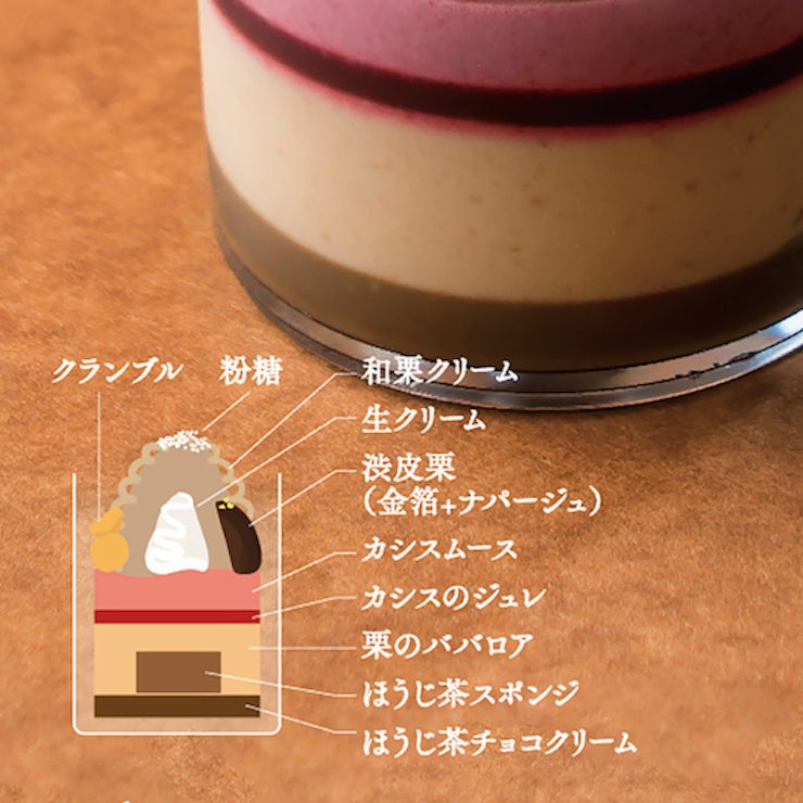 和栗を使用した特製モンブランクリームは、こっくりとした素朴な甘さに仕上げ、滑らかな食感になるよう丁寧に絞った。カシスムースとカシスジュレの甘酸っぱさが、心ときめくアクセント。カップ底には栗のババロアに包まれたほうじ茶生地とほうじ茶チョコクリームを配している。ふんわりと鼻に抜けるほうじ茶の芳しさが余韻として残り、最後まで飽きることなく楽しめる一品だ。
