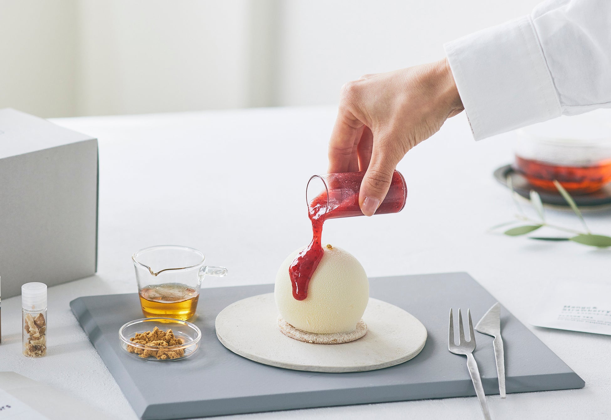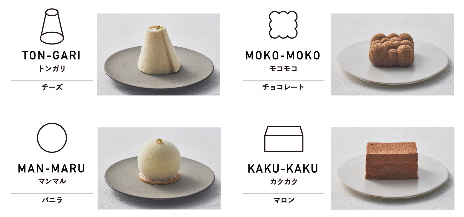 メインは、ベース×フルーツ×フレーバー×フレーバーティの4つの掛け合わせを自分でセレクトできるセット。選ぶ時から食べ終わるまでのワクワクする体験を提供。なじみのあるスイーツたちを、一見ケーキに見えない不思議な形で再現。想像力がかきたつように、装飾も色もシンプルな形に。親しみやすいよう、形から連想される名前をつけている。