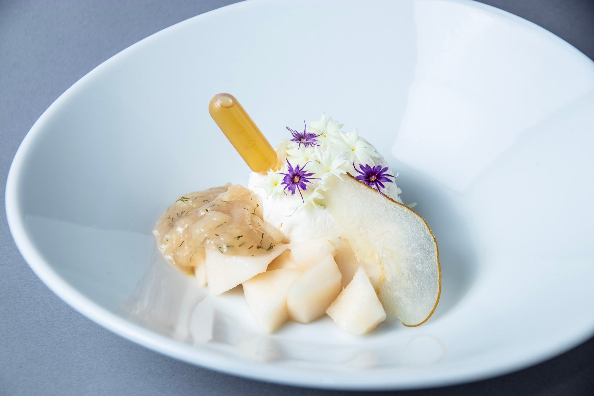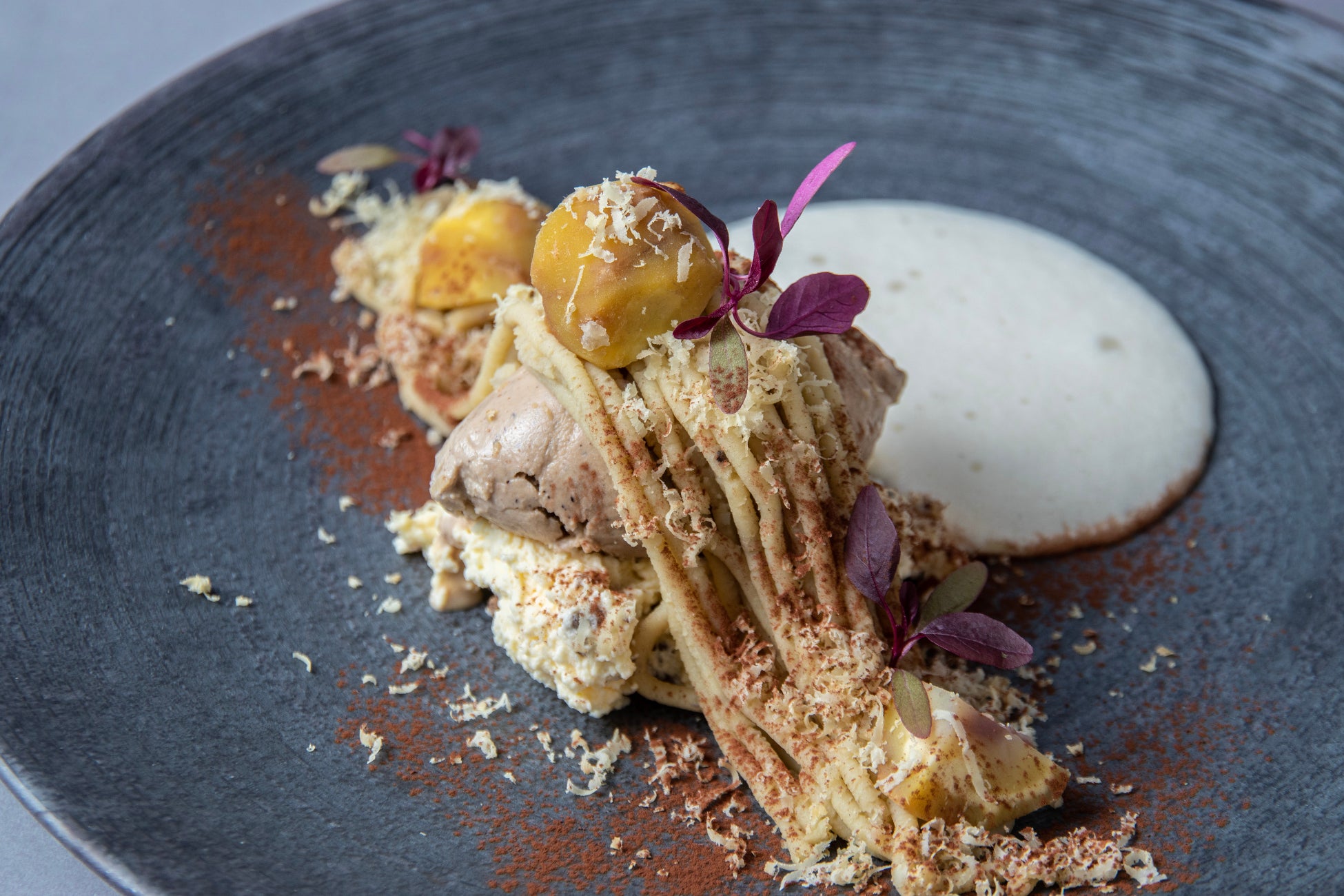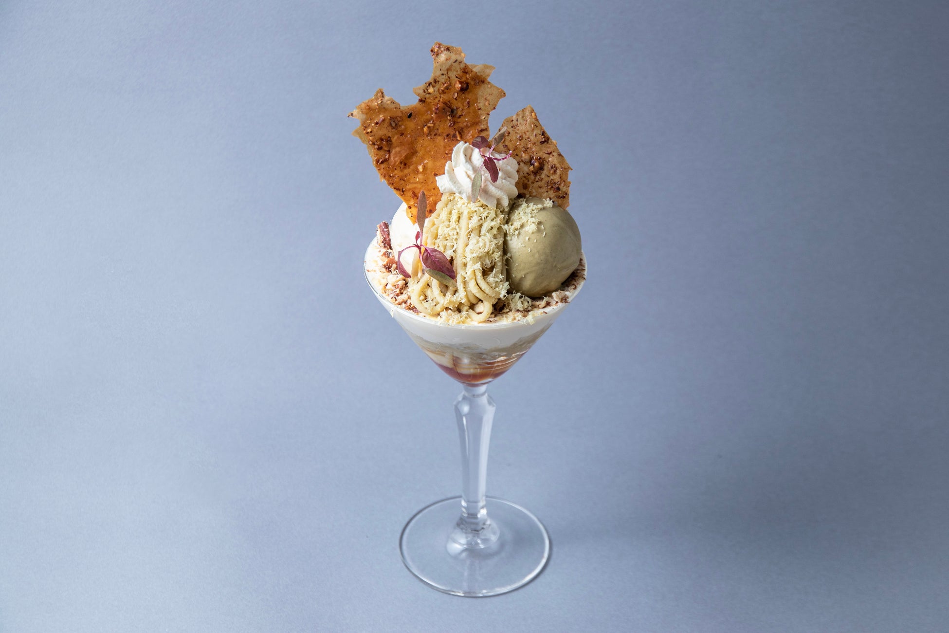 絶景のリバービューを望むテラス10席と上質な家具に囲まれた店内には、デザートになじむシックなソファやこだわりのチェア、そして目の前でデザートを作り上げるパフォーマンスを楽しめるカウンターを新設した全35席。カラーのトーンを落とした内装は、彩り豊かなフルーツを用いたデザートを引き立て、夜は多数のキャンドルが灯る空間で至高の一杯を堪能できる。