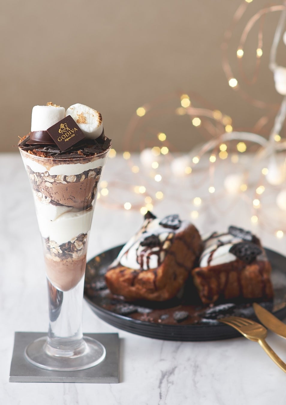 12月から新登場するメニューは、マシュマロとチョコレートを使用した冬限定のパフェ「GODIVAチョコレート&マシュマロパフェ」や、「GODIVAブリュレフレンチトースト チョコレート&マシュマロ」、「チョコレートティラミス」の3商品と、ベルギー産のチョコレートを使用したオレンジ風味のチョコレートケーキ「ベルギーチョコケーキ オレンジ風味」や、「ガトーショコラ」、「チョコメロンパン」、「チョコチップスコーン」、「チョコソフトクッキー」の新定番メニュー5商品です。いずれもゴディバカフェでしか味わうことができない、オリジナル商品だ。