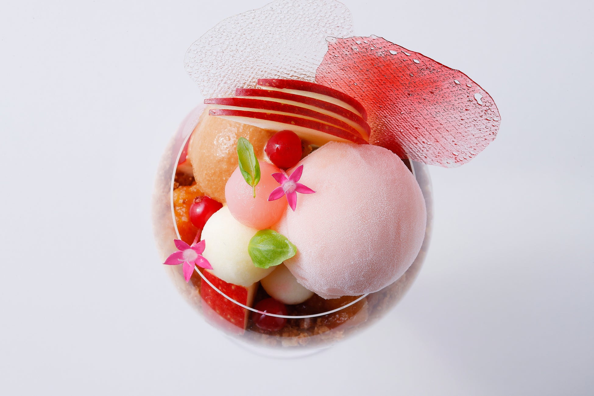 トップにはほんのりピンク色に染まった紅玉のソルベと、濃厚なキャラメルジャンドゥーヤのジェラート。ピンクのグラデーションが美しい飴細工と繊細なカッティングが美しいフレッシュなりんごが、トップ部分にアルマーニらしい華やぎを添えている。
