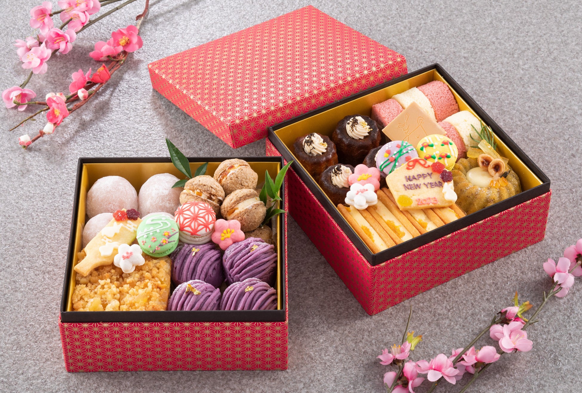 二段重ねの重箱に、梅をモチーフにしたマカロンや紅白のロールケーキなどを詰め合わせた華やかなスイーツ重。色とりどりのスイーツは、おせちの後のスイーツとして、また、新年の挨拶の手土産としてもおすすめだ。