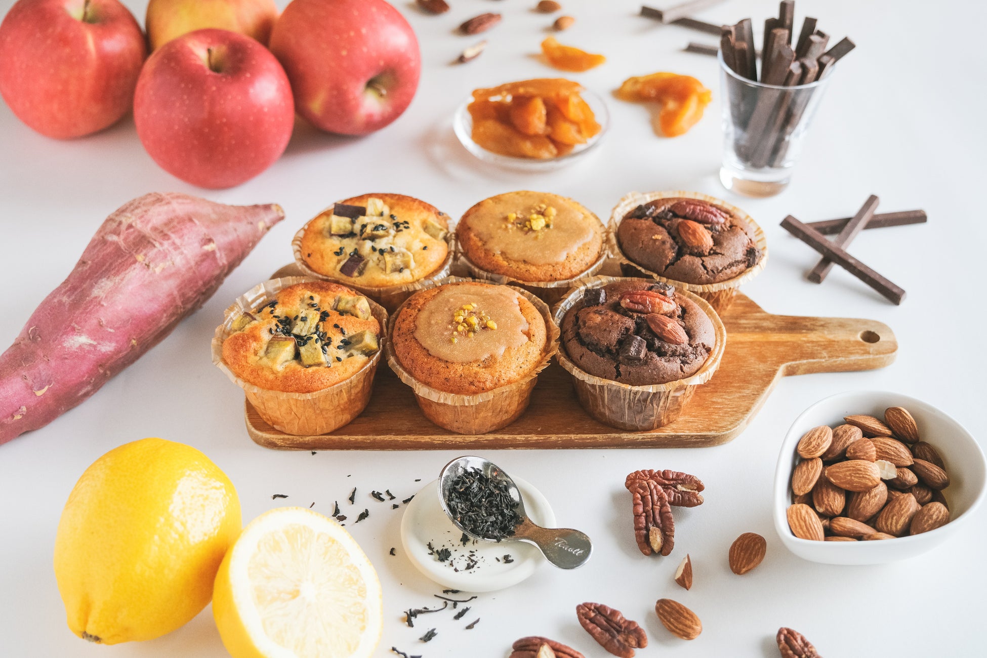 米粉のマフィンで「罪悪感なく食べられるご褒美」を目指したという。バター不使用、グルテンフリーにこだわり完成した3種類のフレーバーを用意している。