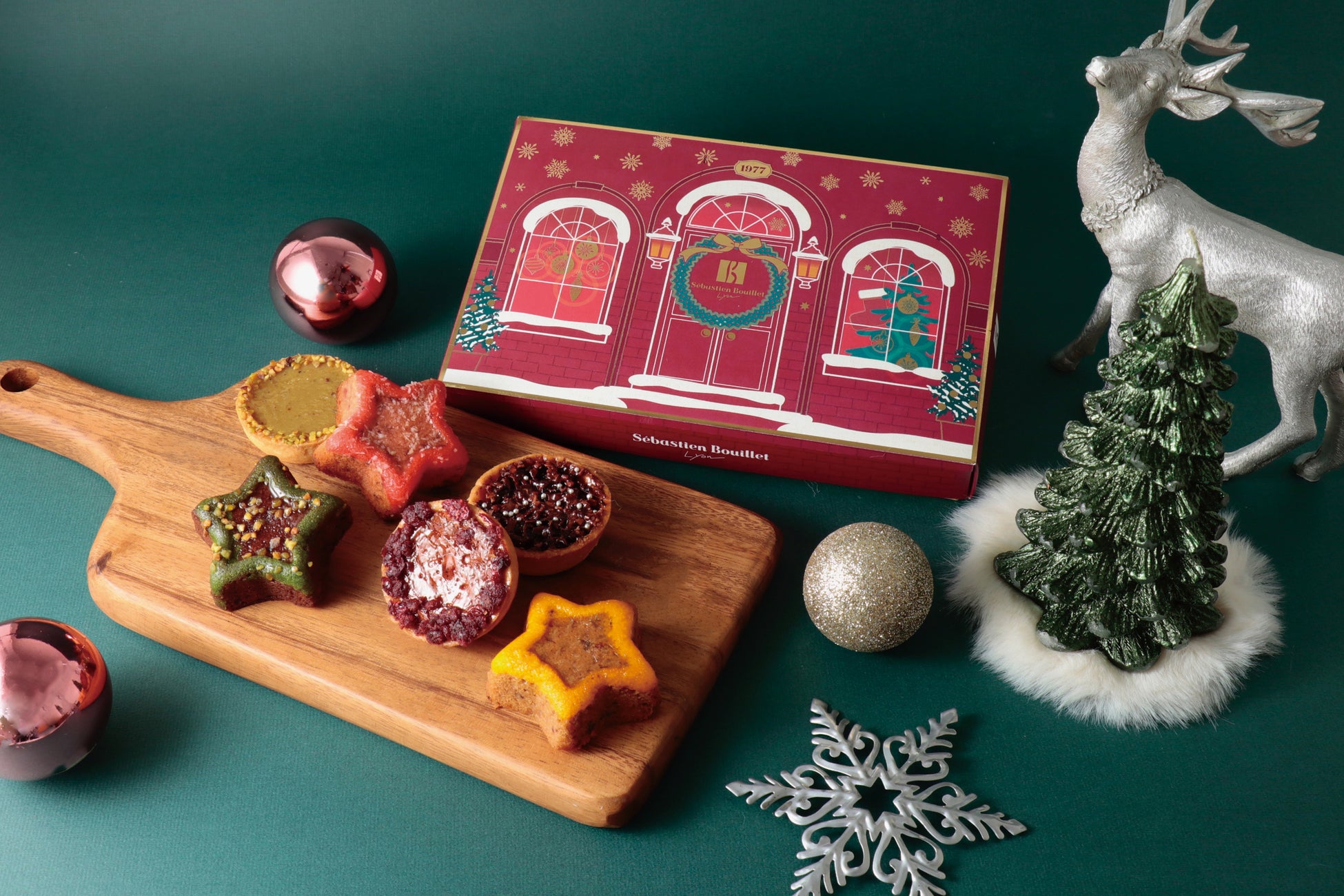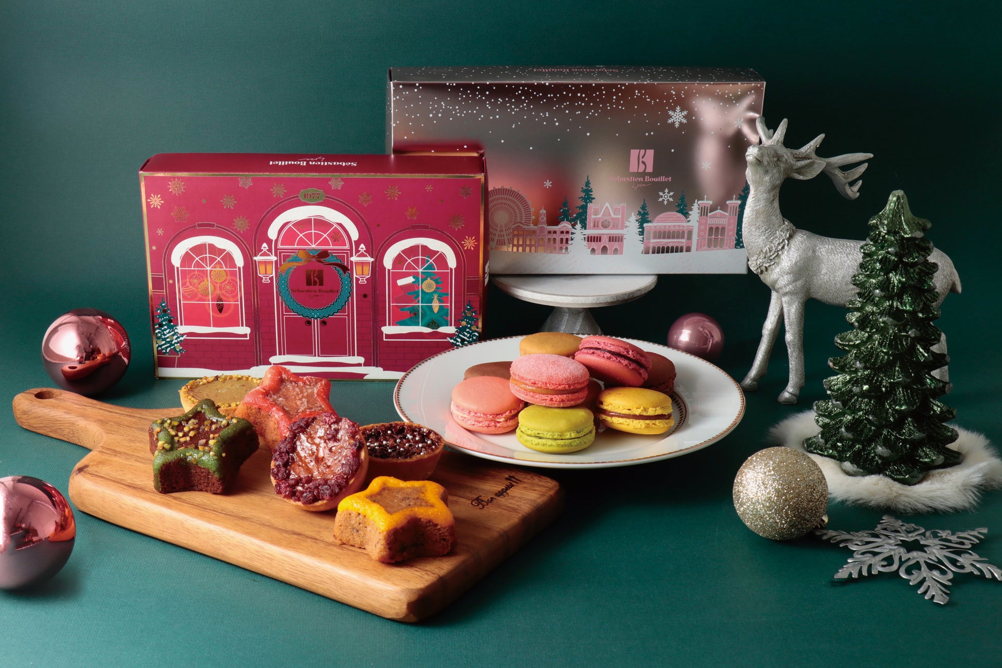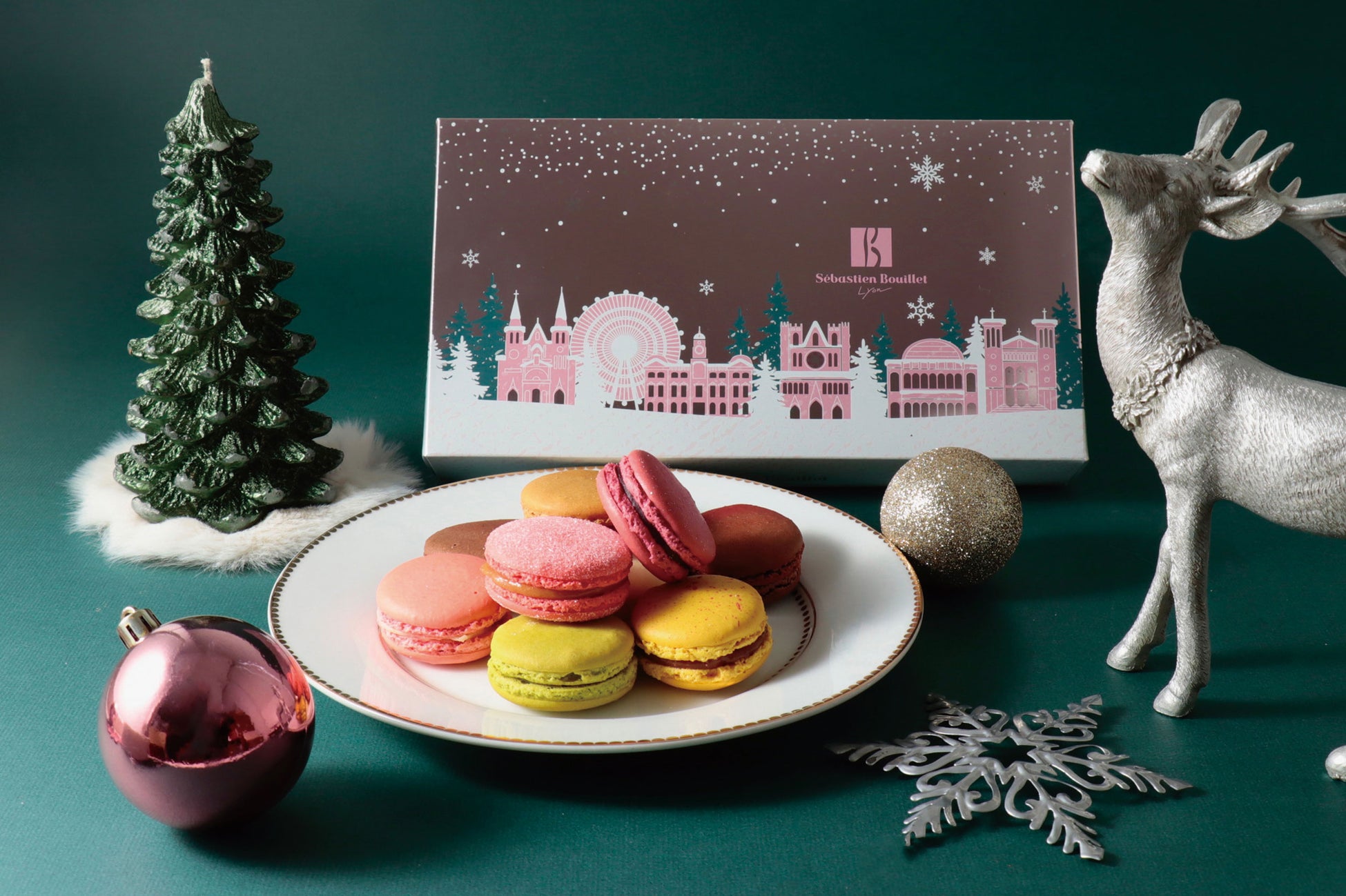 フランス・リヨンのパティシエ兼ショコラティエ「セバスチャン・ブイエ」。今冬提供するのは冬限定の「マカロン ディヴェール」や彩り豊かな焼菓子のギフト「コフレノエル」。冬の季節感を取り入れた特別なフレーバーを華やかなデザインボックスに入れて提供する。