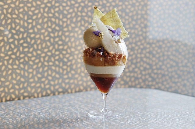 その下には、ウイスキーで香りづけをした軽やかなガナッシュ、洋梨ゼリー、紅茶のゼリーとフレッシュオレンジへと続き、後半部は味覚と香りが次々に変化。食べ応えのあるパフェに仕上がった。