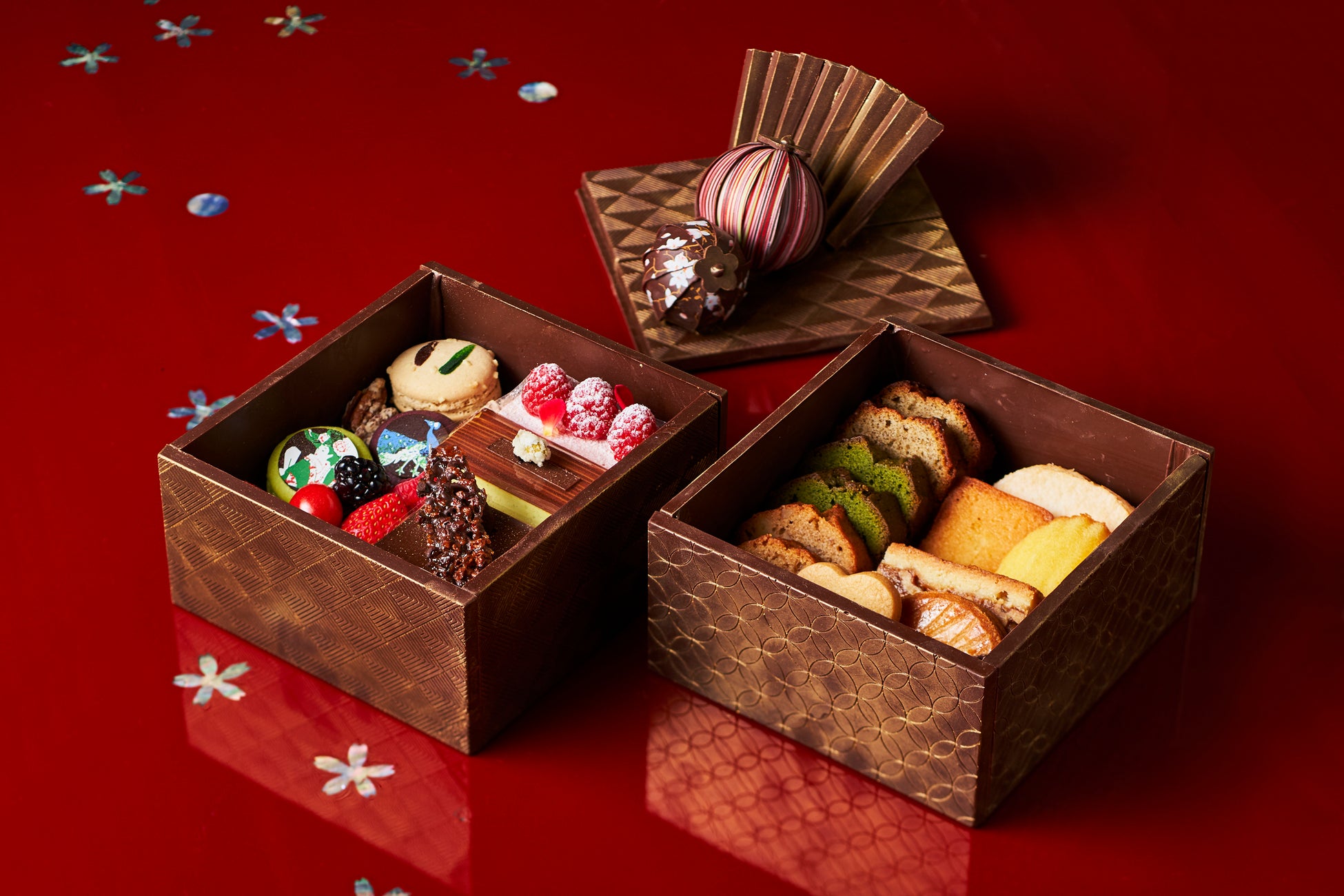 2023年は、縁起ものをテーマにした彩り豊かな「舞い扇」、さまざまな吉祥文様をあしらった「文様チョコ」など新作をはじめ、ホテル内にある美術品の天井画をイメージしたボンボンショコラなど、ホテル雅叙園東京ならではのスイーツを提供する。