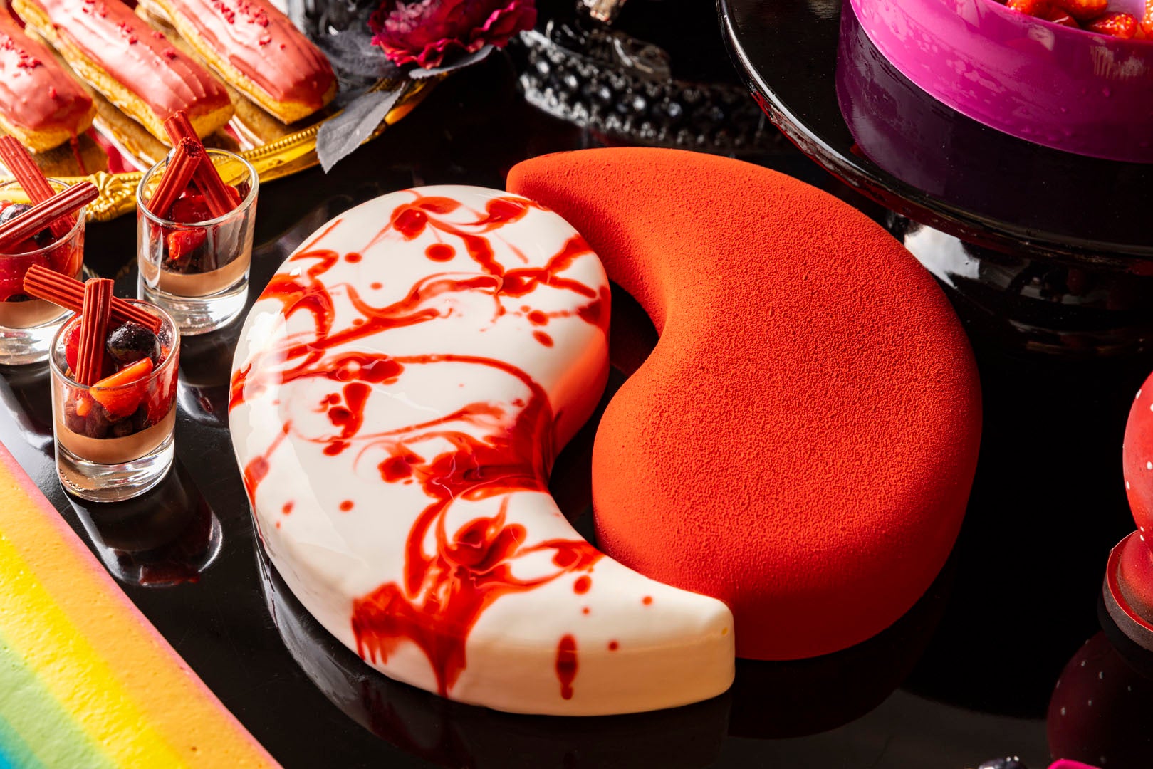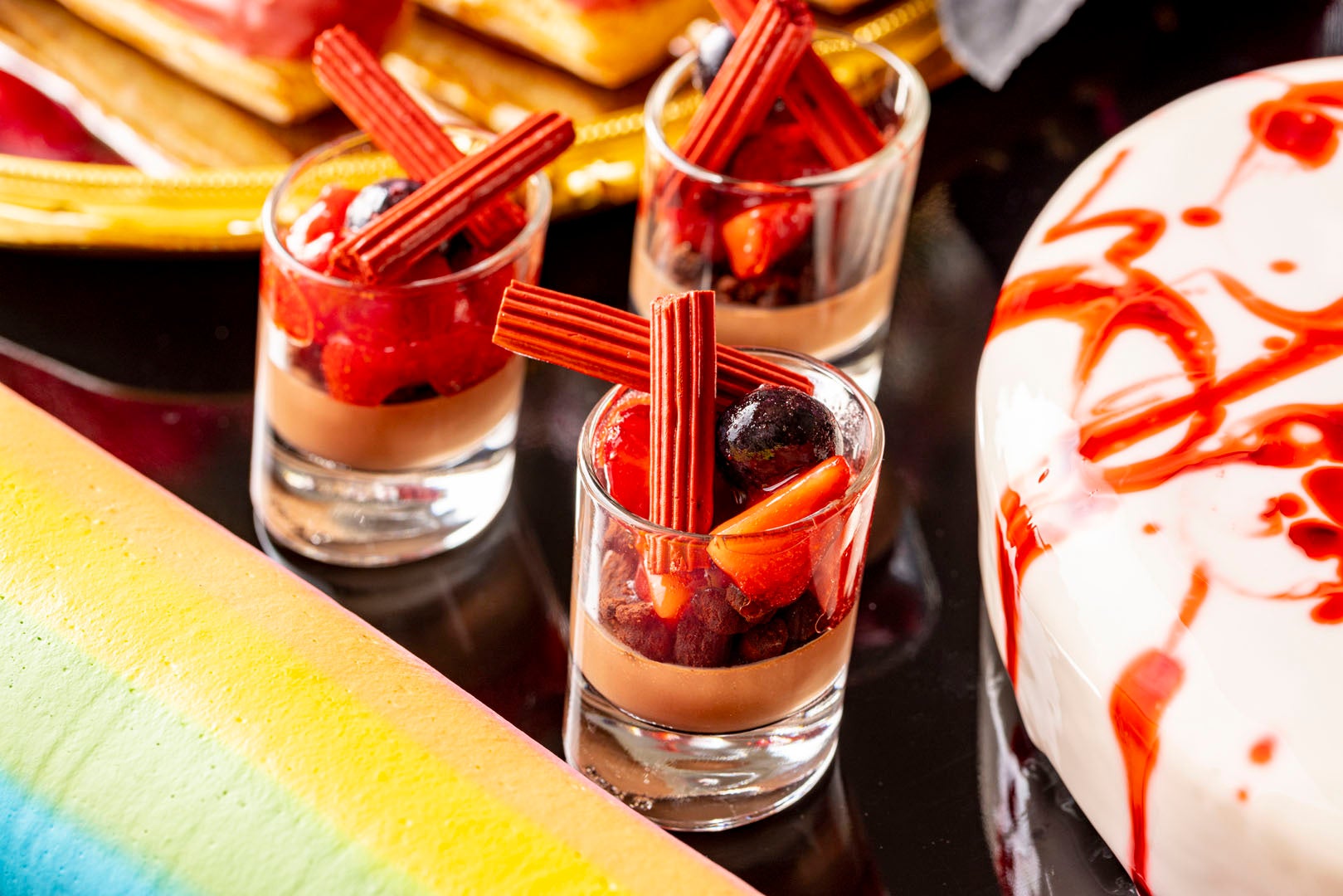 今年のイチゴのスイーツビュッフェは、仮面舞踏会をテーマに展開。黒をベースにした仮面舞踏会の会場をイメージそのままに、イチゴの赤色、さまざまな人の個性やアイデンティティの象徴としてカラフルなレインボー色が映える「Strawberry Masquerade」の世界観をつくり上げた。