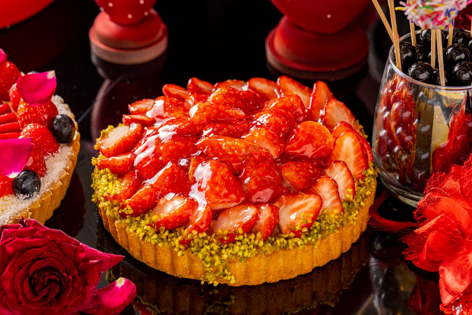 イチゴスイーツの王道「ストロベリーショートケーキ」や「ストロベリータルト」をはじめ、今人気のピスタチオと組み合わせた「ストロベリー&ピスタチオムース」、ブルーベリーと組み合わせてより甘酸っぱく、華やかに仕立てた「ホワイトチョコレート&ブルーベリームース ストロベリー飾り」、イチゴを象ったデコレーションムース「ストロベリーフロマージュブランムース」、レインボーカラーのクリームを添えた「レインボーストロベリーロールケーキ」などスイーツ18種類、セイボリー6種類を提供する。