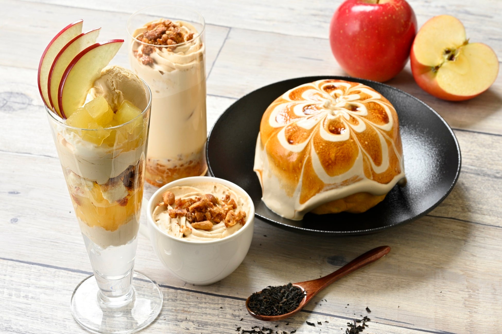 同店は今回、限定フレーバー「北海道りんごと紅茶」のスイーツを提供。りんご栽培発祥の地といわれる北海道七飯町(ななえちょう)産のリンゴから作られたコンポートを用いたパンケーキやパフェのほか、ドリンクの中に北海道産リンゴが隠れているラテなどを用意した。