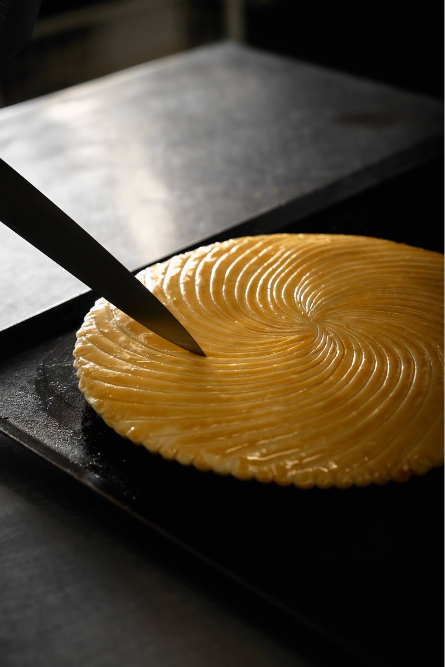 「ガレット デ ロワ」の特徴でもある「レイエ」と呼ばれる艶やかな模様を職人たちが包丁でひとつずつ飾りつけ。モンサンクレールでは生命を意味し、ロゴマークにも用いている太陽をイメージした飾りで仕上げている。「ガレット デ ロワ」の中には陶器の人形(フェーブ)が入っており、切り分けた中にフェーブが当たった人は祝福を受け、幸運が1年間続くといわれる。