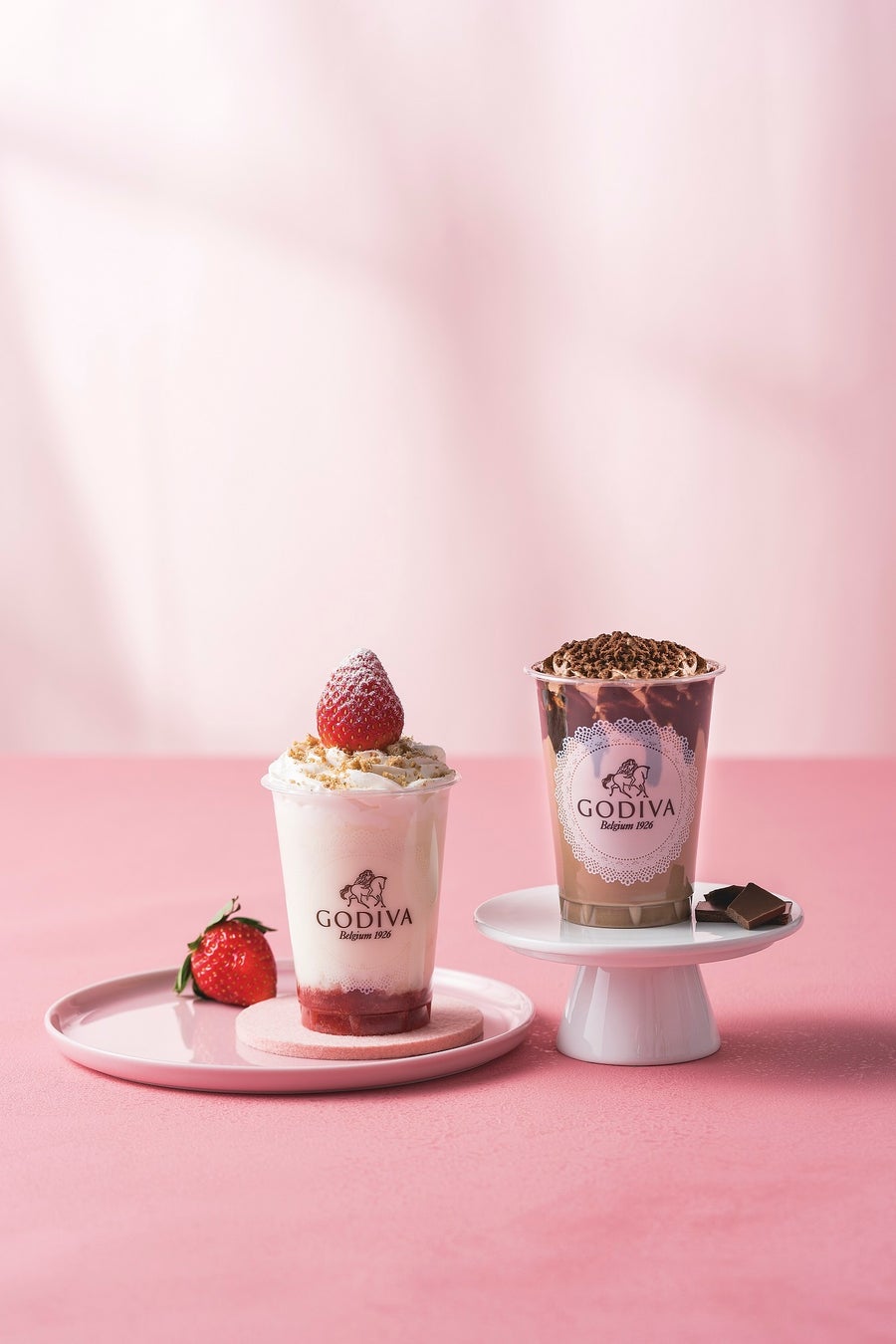 あたかもケーキのような味わいのデザートドリンク「GODIVAデザートドリンク ストロベリーショートケーキ」、「GODIVAデザートドリンク ガトーショコラ」の2種類、口当たりの良いバランスのとれた味を堪能できる、芳醇な香りとコクのチョコレートドリンク全6種類を提供する。