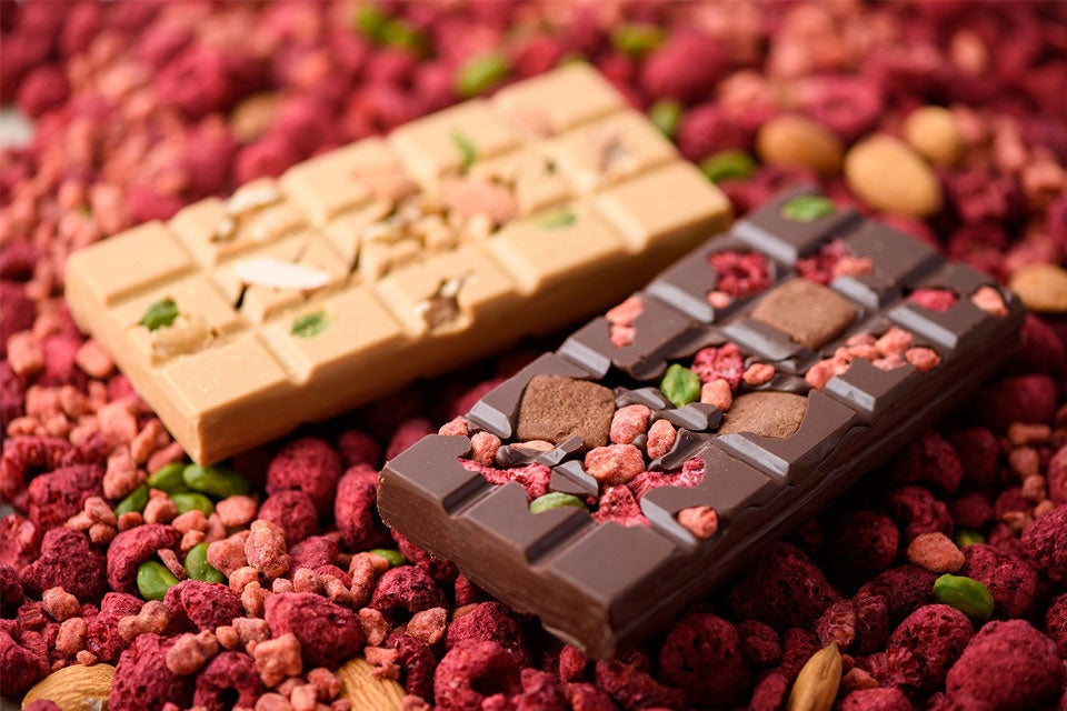 ダークチョコレートは、苺やフランボワーズのドライフレーズとチョコレートクッキーを配し、中にはベリーのコンフィチュールを。ベリーの酸味とチョコレートの苦みが優れた相性だ。