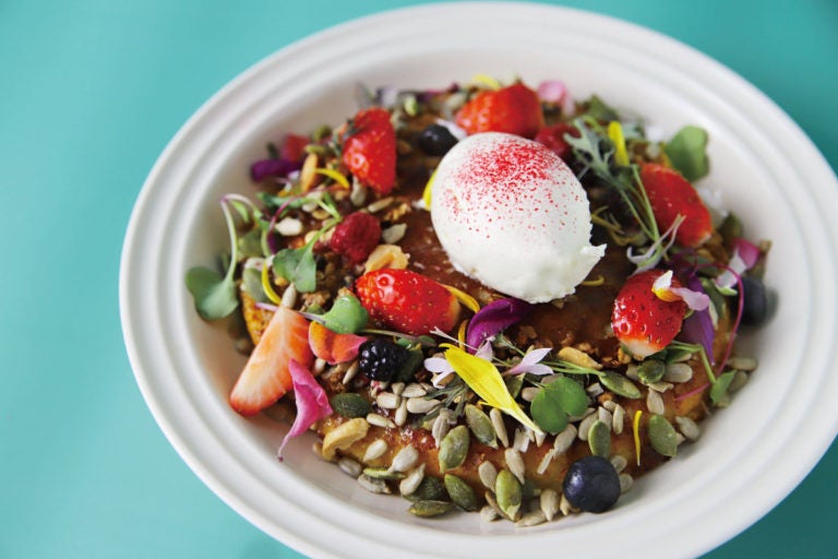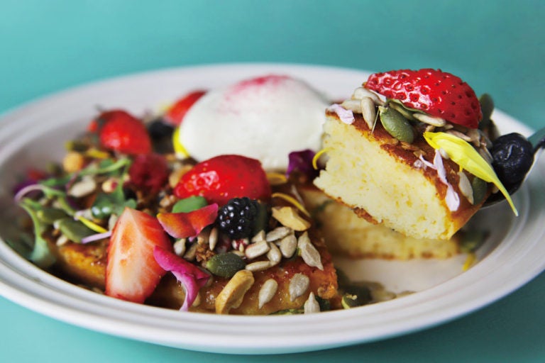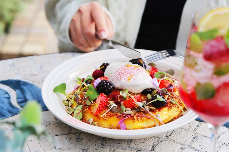 エディブルフワラー、苺やラズベリー、パンプキンシードやマイクロリーフが散りばめられた華やかなパンケーキ。フランス産の薄力粉をベースに、リコッタチーズ、バターミルクで軽やかな食感に焼き上げ、きび糖シロップを染み込ませた、ジューシーな口溶けのパンケーキだ。