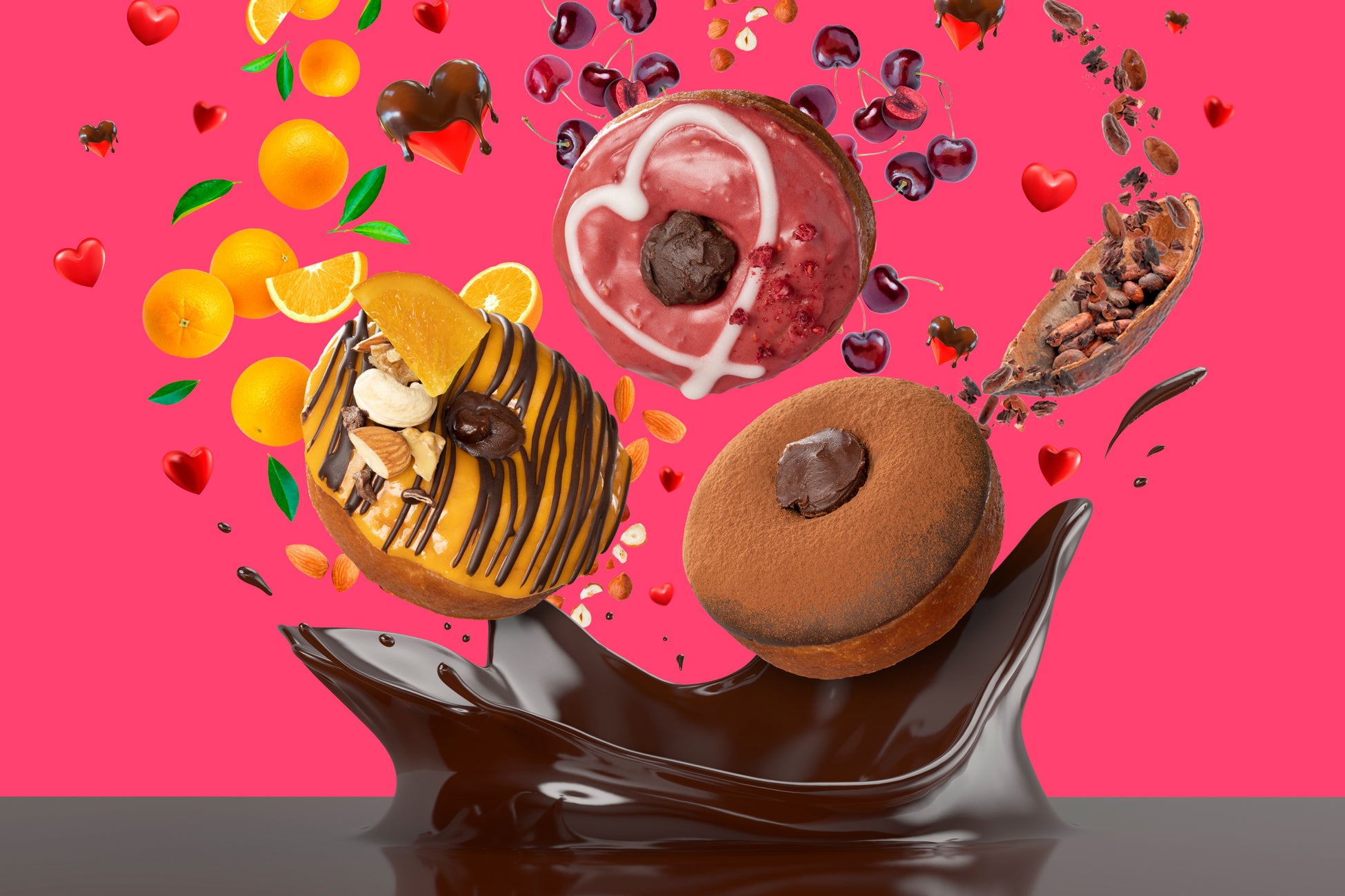 「ジャンドゥーヤチェリードーナツ」は、ヘーゼルナッツの香りを包んだフィリングと甘酸っぱいチェリーグレーズが好相性。「ショコラオランジェドーナツ」は、オレンジピールを入れたフィリングや爽やかなオレンジグレーズ、トッピングのドライオレンジが加わり、トリプルでオレンジの風味が感じられる。テイストが異なるチョコレートフィリングにチョコレートと相性の良い素材を用い、豊かな味わいや見た目を実現している。