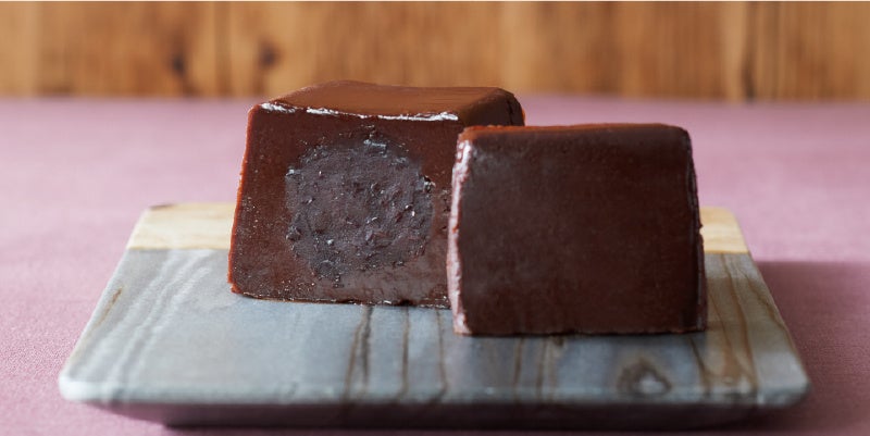 シェフがカカオと組み合わせたのは、豊かな風味の北海道産エリモ小豆。カカオと小豆が織りなす相性にこだわった一品。すっきりした甘みで程よくビターなチョコレートと小倉あんのコンビネーションに注目だ。