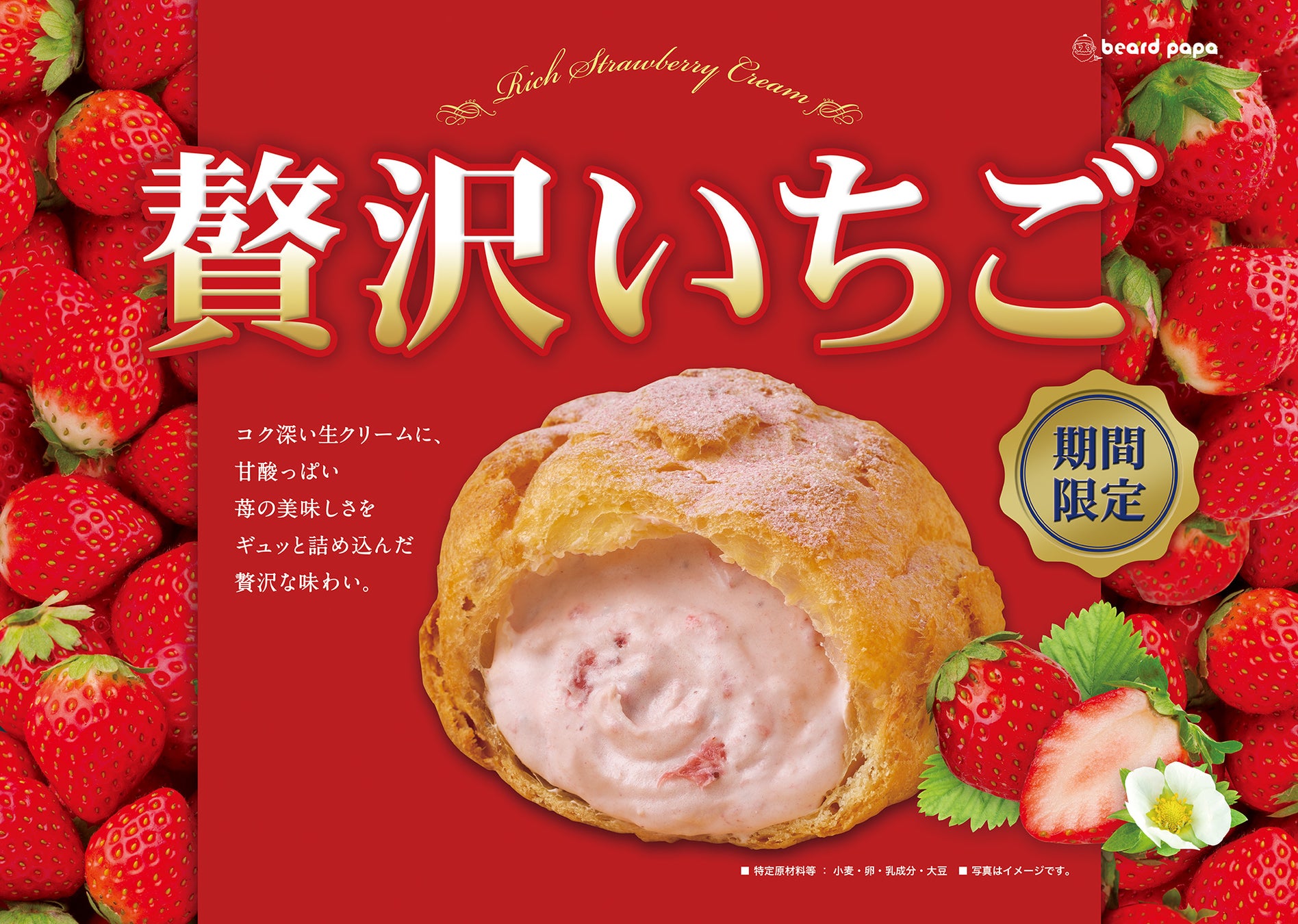 シュークリーム専門店「ビアードパパ」は1月1日より期間限定で「贅沢いちご」の販売をスタートした。生クリームにイチゴを合わせたクリームがシュー生地と好相性。ビアードパパで長年愛されている、毎年人気の季節限定シュークリームだ。2月28日まで、税込み250円で販売する。